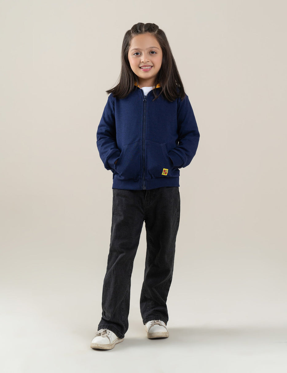 Keep her cozy and stylish with this essential zip-up hoodie for little girls. Designed in a rich navy blue with a contrasting bright yellow hood lining, it adds a fun pop of color to her everyday outfits. Made from soft, comfortable fabric, it features ribbed cuffs, front pockets, and a smooth zipper for easy wear. Perfect for school, playtime, or layering on cooler days. A cute floral patch adds a sweet finishing touch!