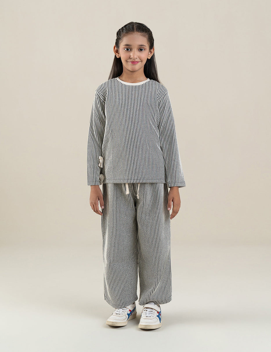 Keep your little girl stylish and comfortable with this 2-piece black and white striped outfit. The set includes a long-sleeve top with cute side-tie details and a pair of matching wide-leg pants with an elastic waistband and drawstring for a perfect fit. Made from soft, breathable cotton-blend fabric, this outfit offers all-day comfort — ideal for school, playdates, or casual outings. The timeless striped pattern gives it a chic, trendy look that’s easy to mix and match with other wardrobe pieces.