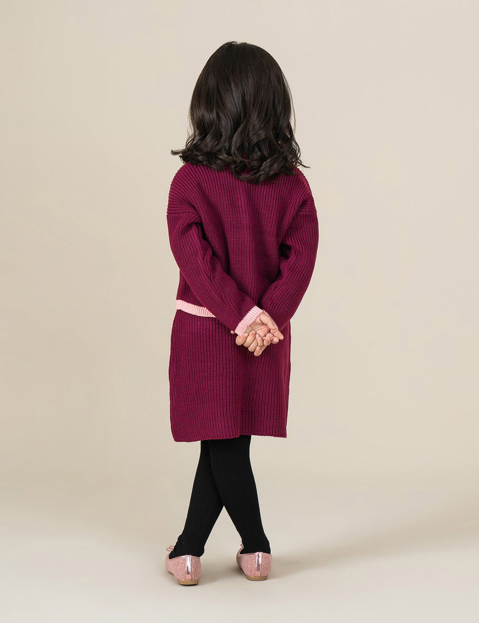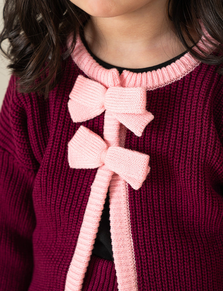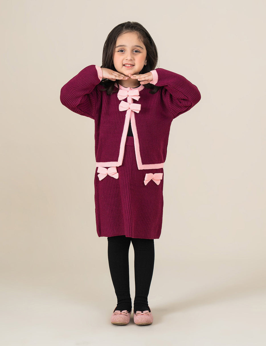 Add a touch of elegance to your little girl’s outfit with this Bow Accent Knitted Cardigan. Featuring a rich maroon knit with contrasting light pink trims and adorable bow details on the front, this outfit perfectly blends warmth with style. Soft, cozy, and fashionable — ideal for family gatherings, outings, or special occasions.