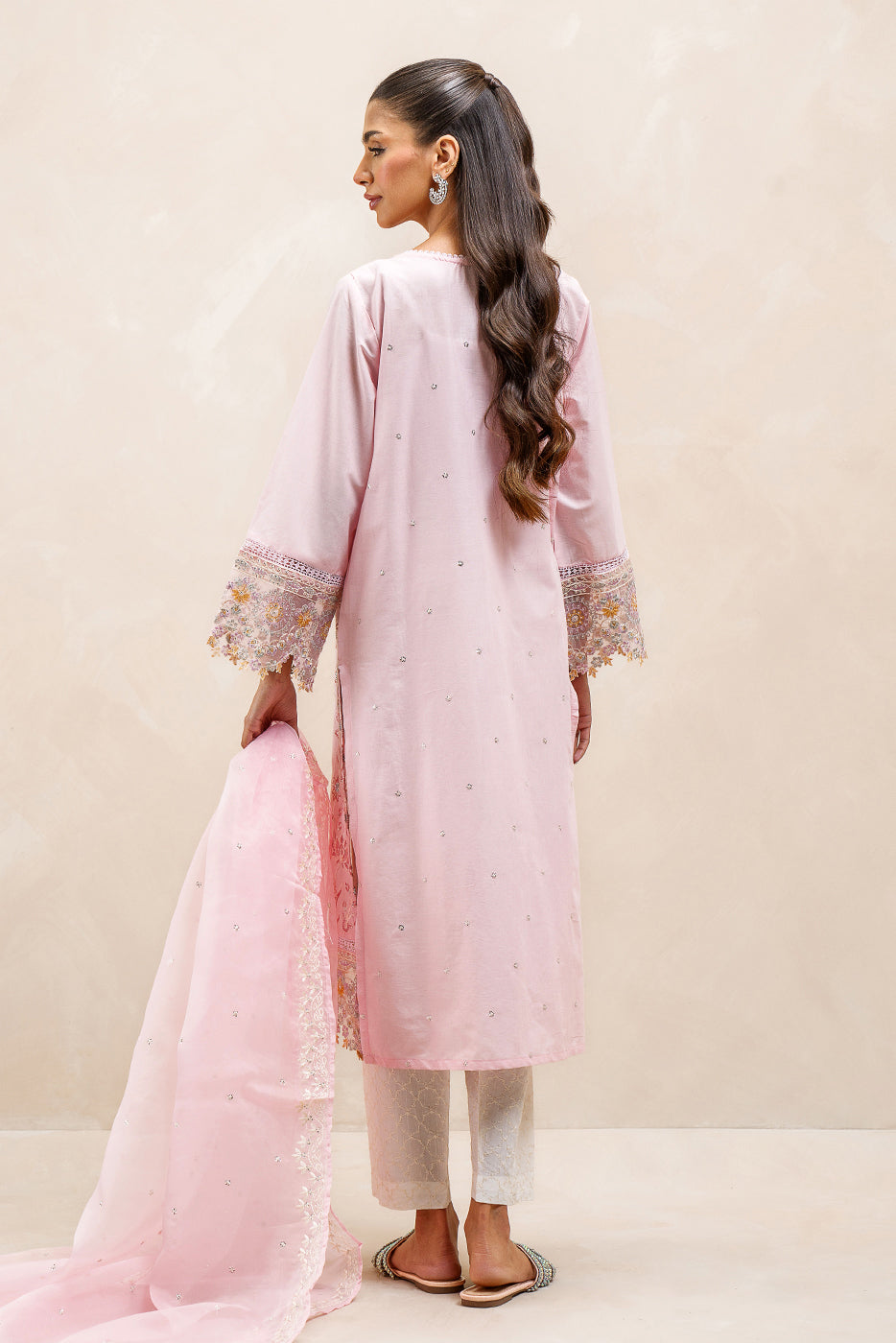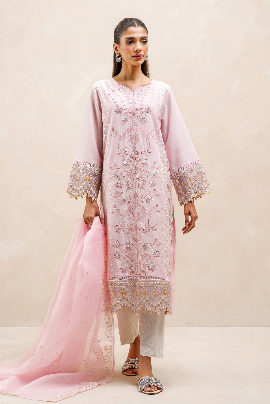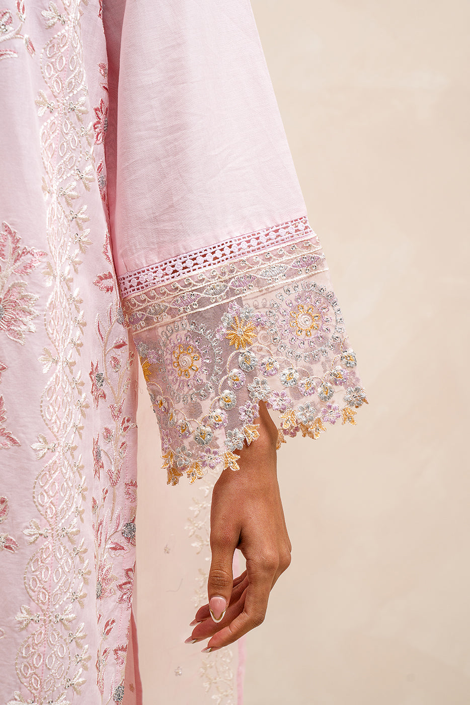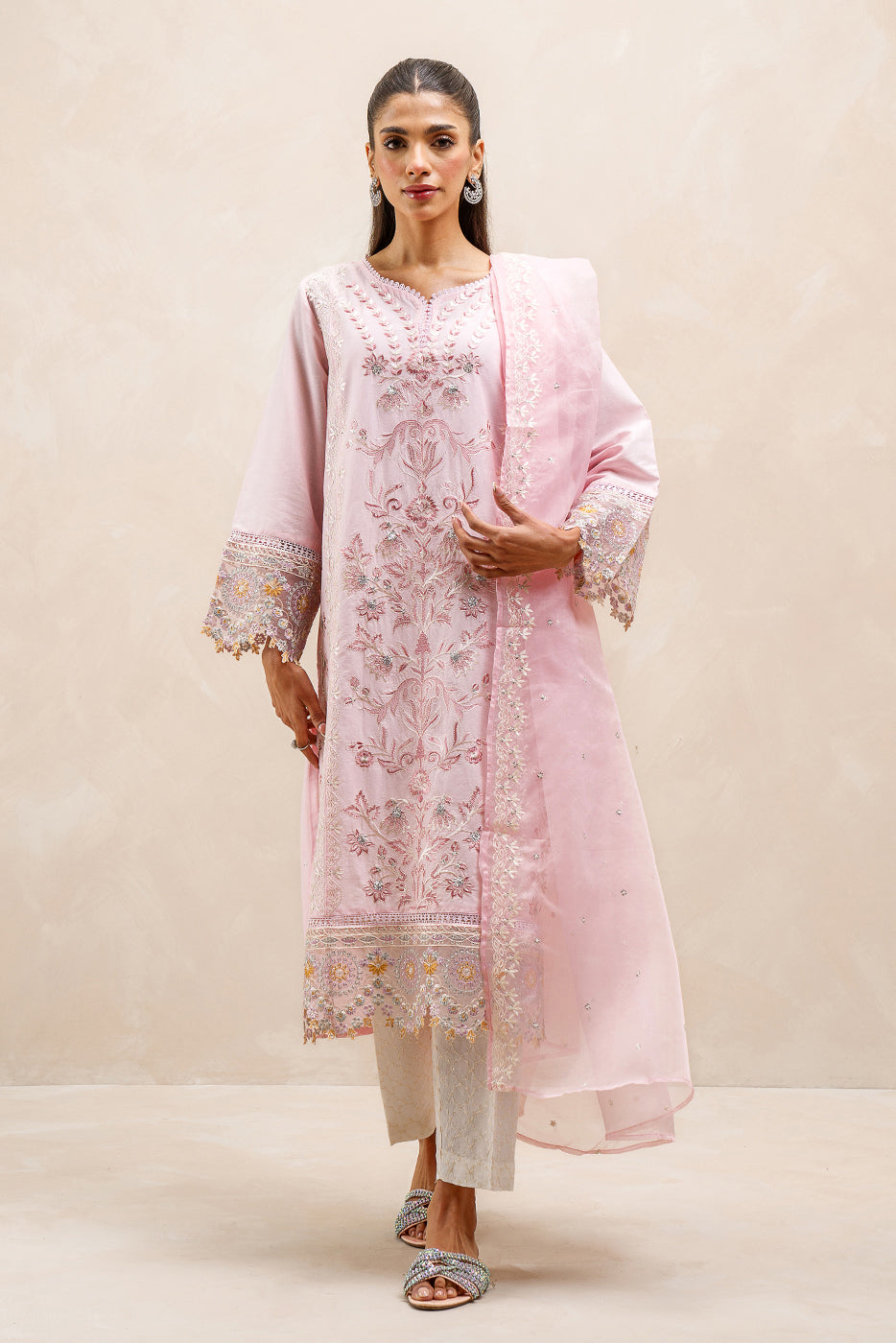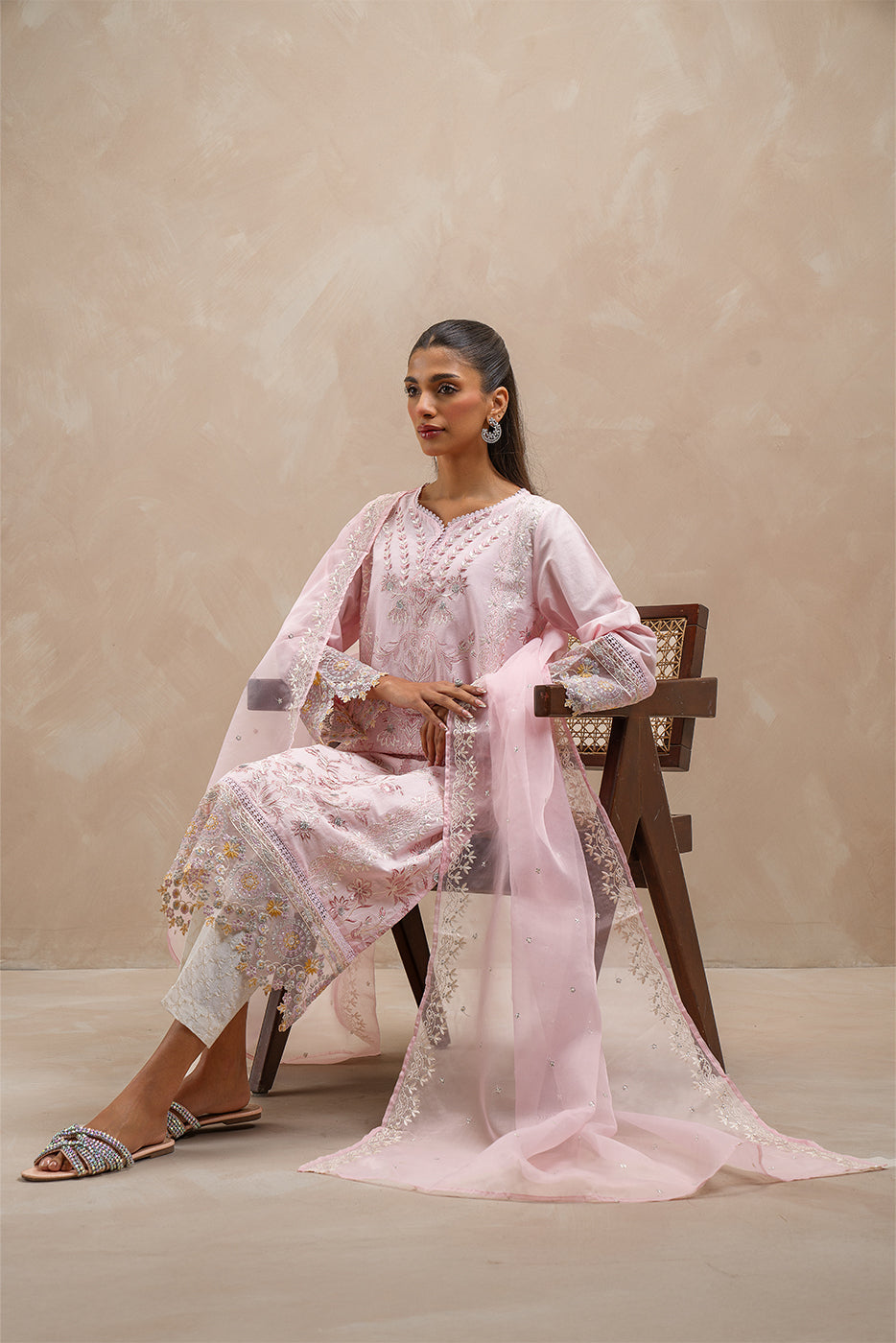 - Description: 2Pc.Embroidered Shirt With Boat Neck And Lace Detail.Sequince Embroidery On Organza Border On Front Hem And Sleeves.Scalloped Border With Lace Detail.Paired With Embroidered Organza Dupatta.