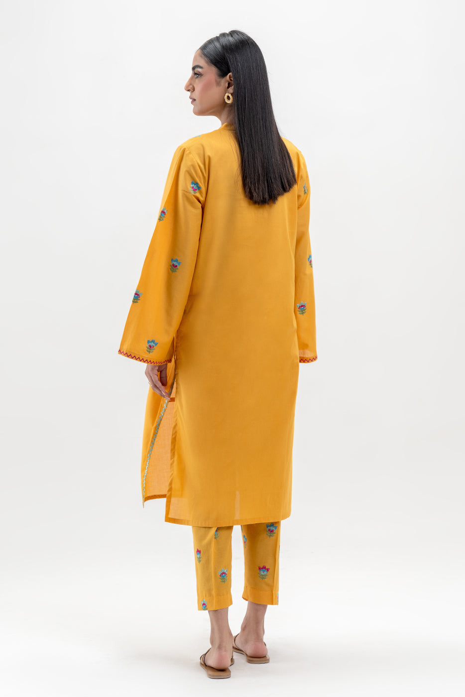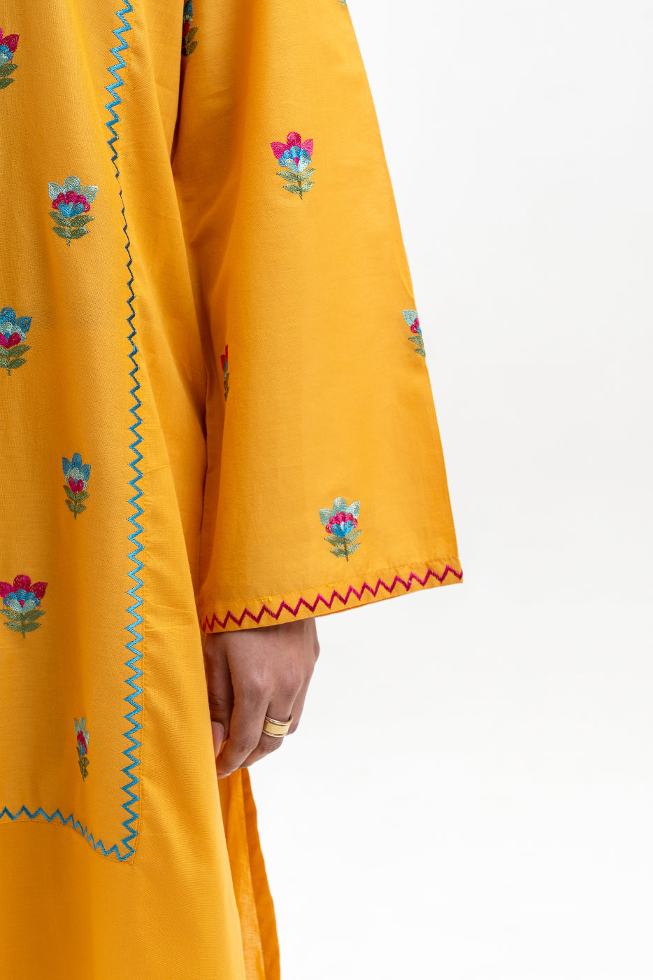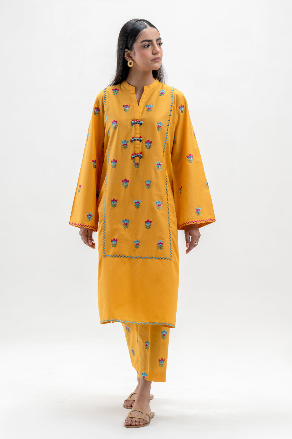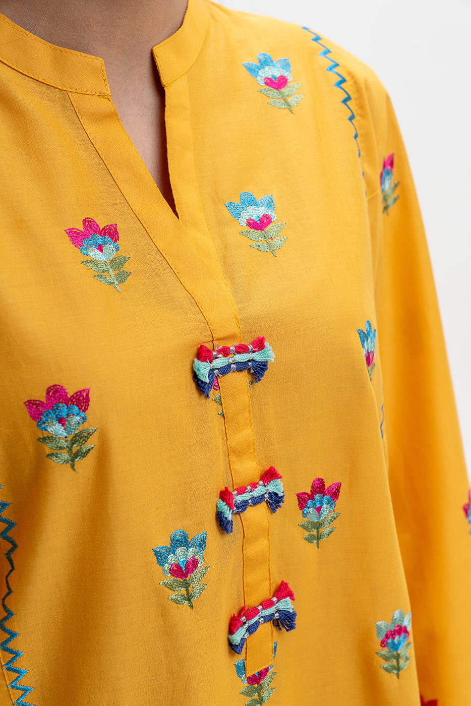 - Description: Embroidered Shirt With Band Collar And Placket With Handwork, Embroidery On Front And Sleeves. Paired With Embroidered Pants And Yarn Dyed Dupatta To Complete The Look.