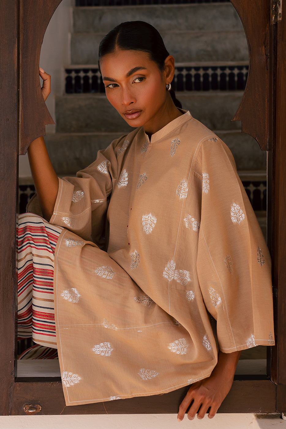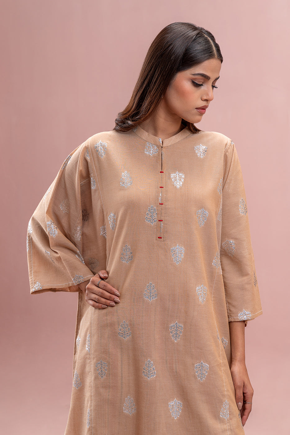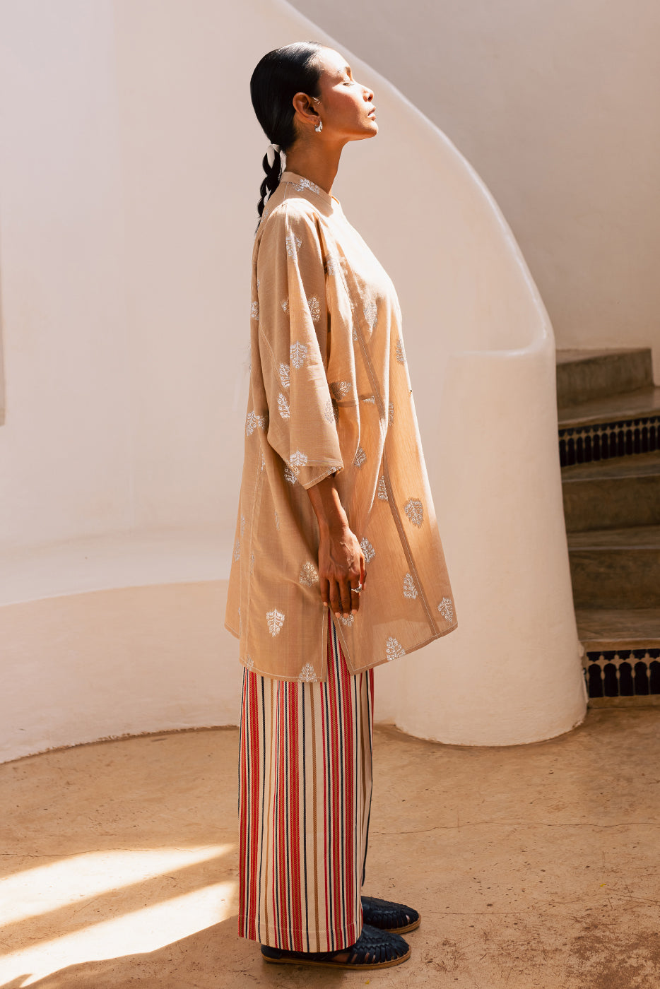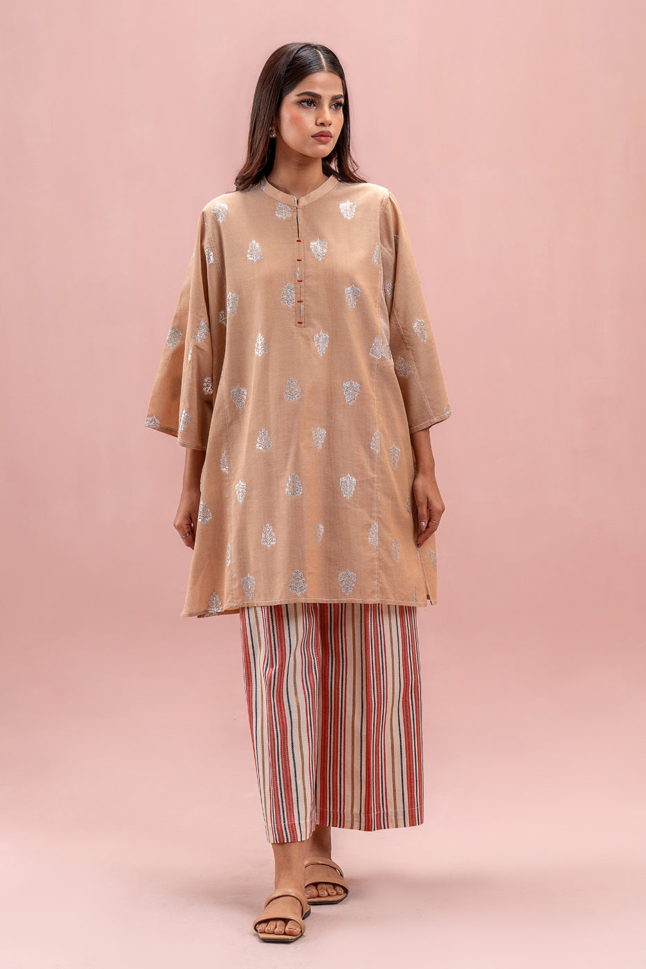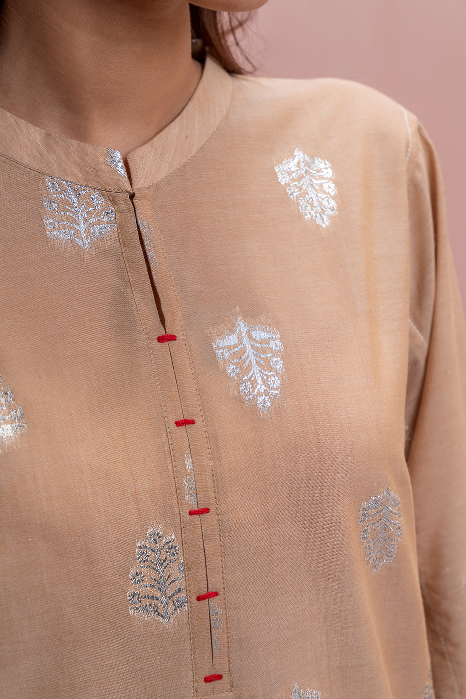 - Description: Basic Shirt With Band Collar And Placket With Contrasting Stitch Detail. Paired With Contrasting Culotte Pants To Complete The Look.