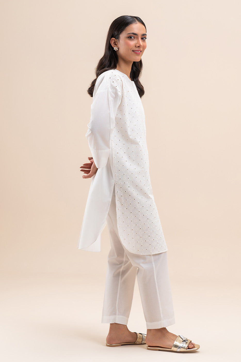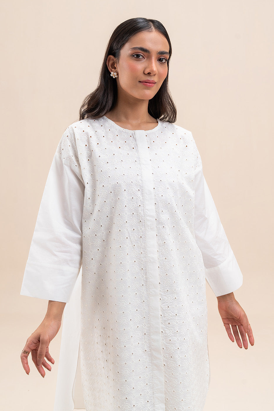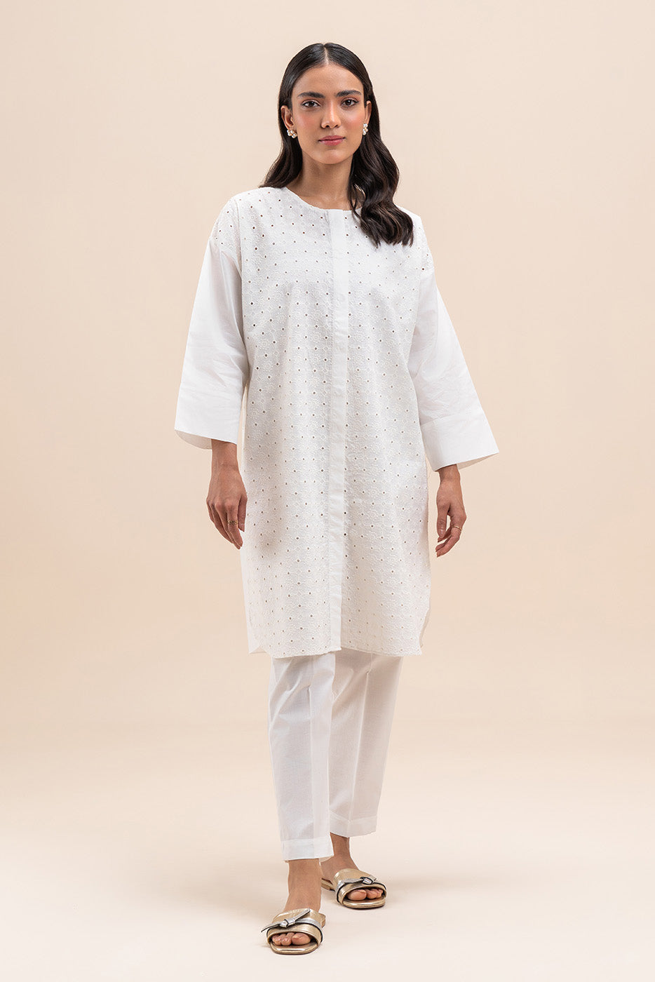 - Description: Schifli Inspired All Over Embroidered Front With Double Placket Detail . Paired With Straight Pants