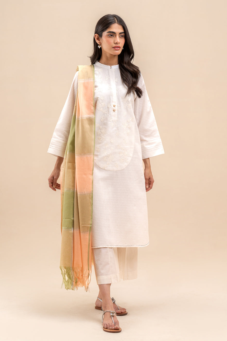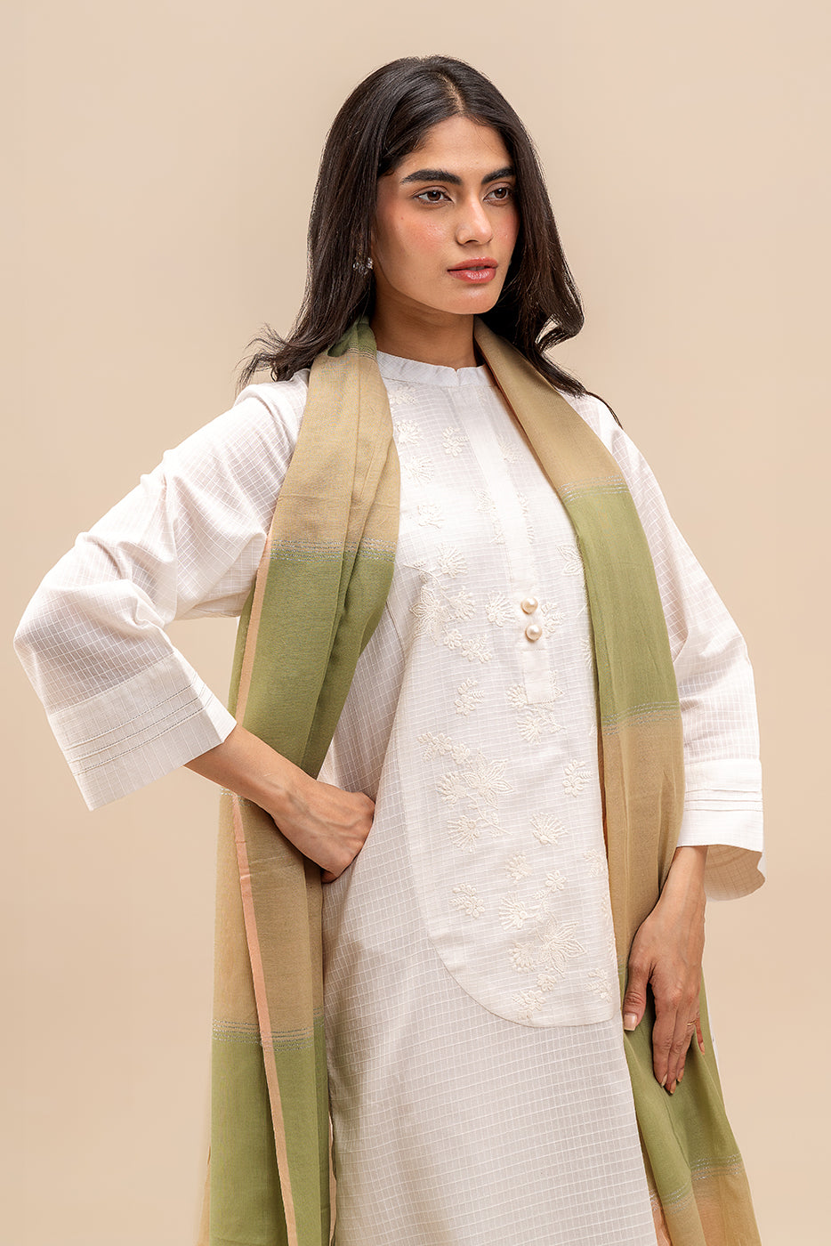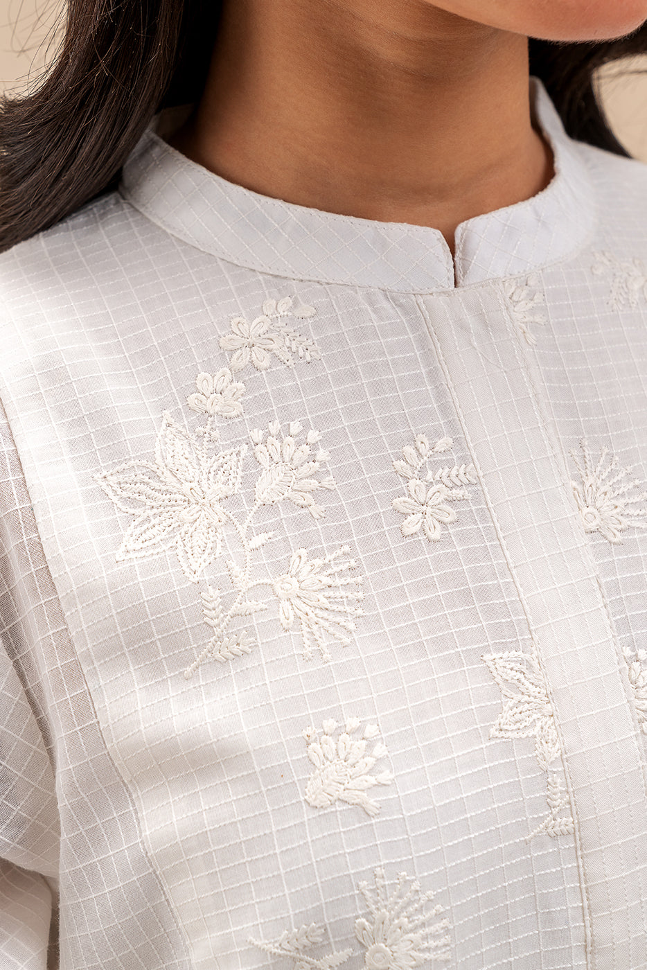 - Description: Self Embroidered Tunic In Cotton Thread With Round Hem Detail . Paired With Dupatta