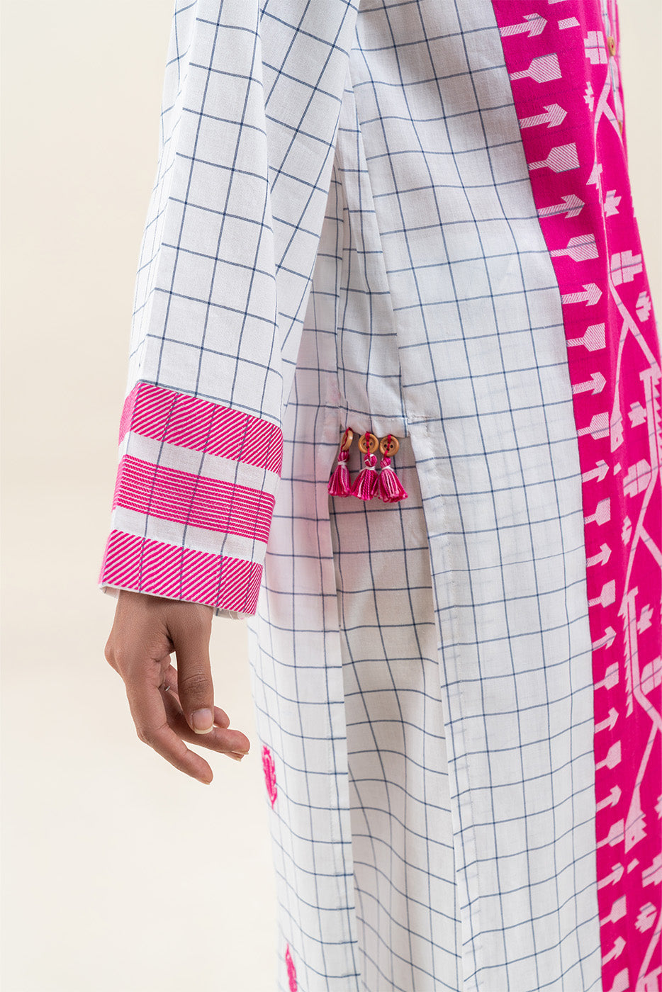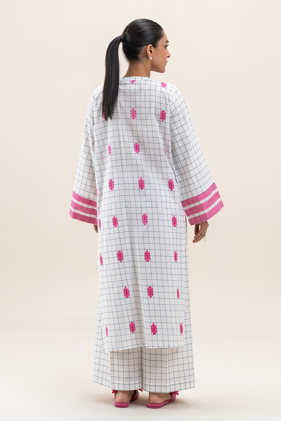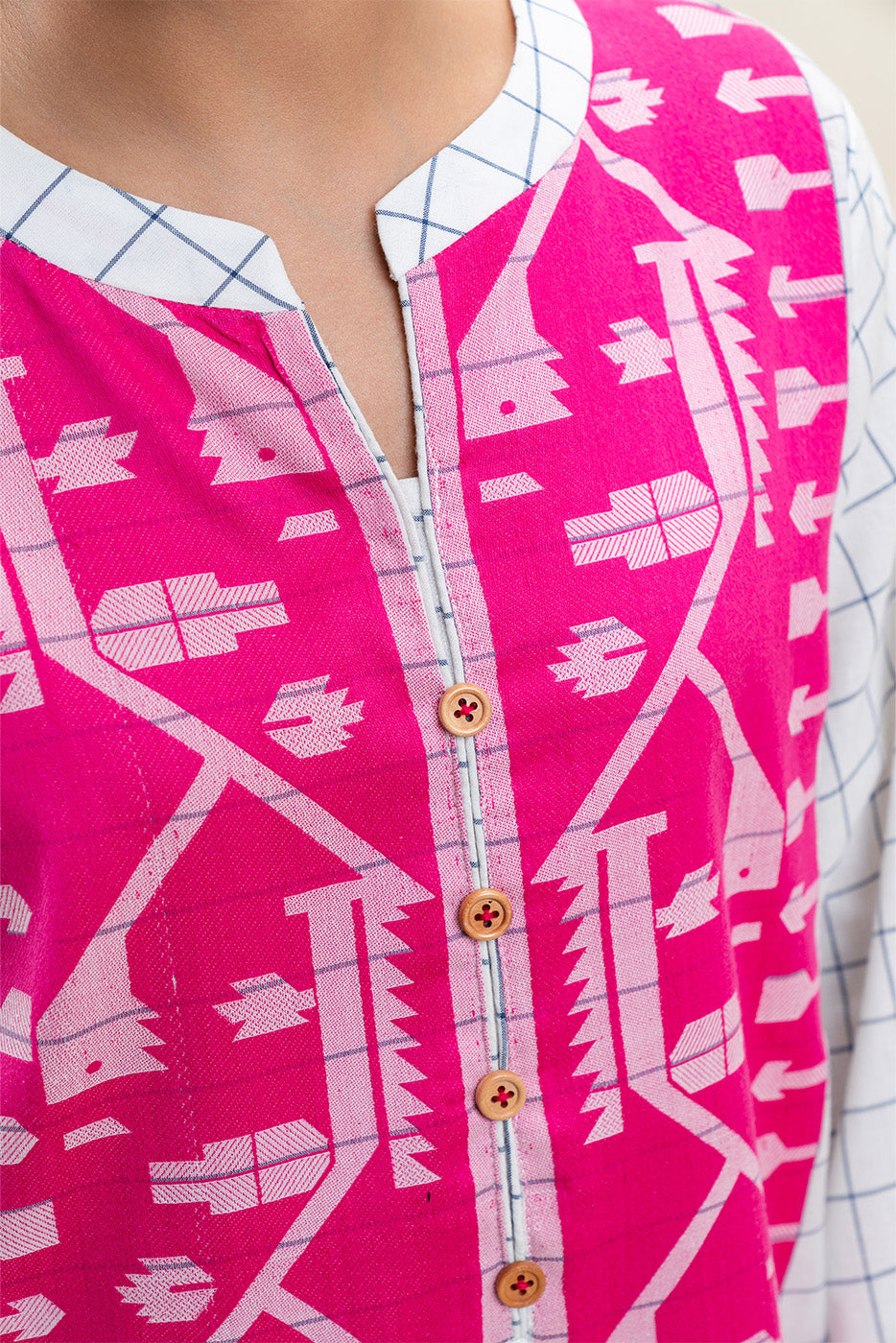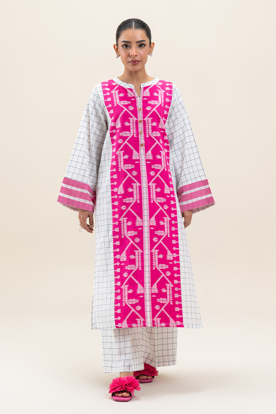 - Description: Contemporary 2-piece printed pret suit featuring a vibrant pink geometric panel on a white grid base with matching straight pants.