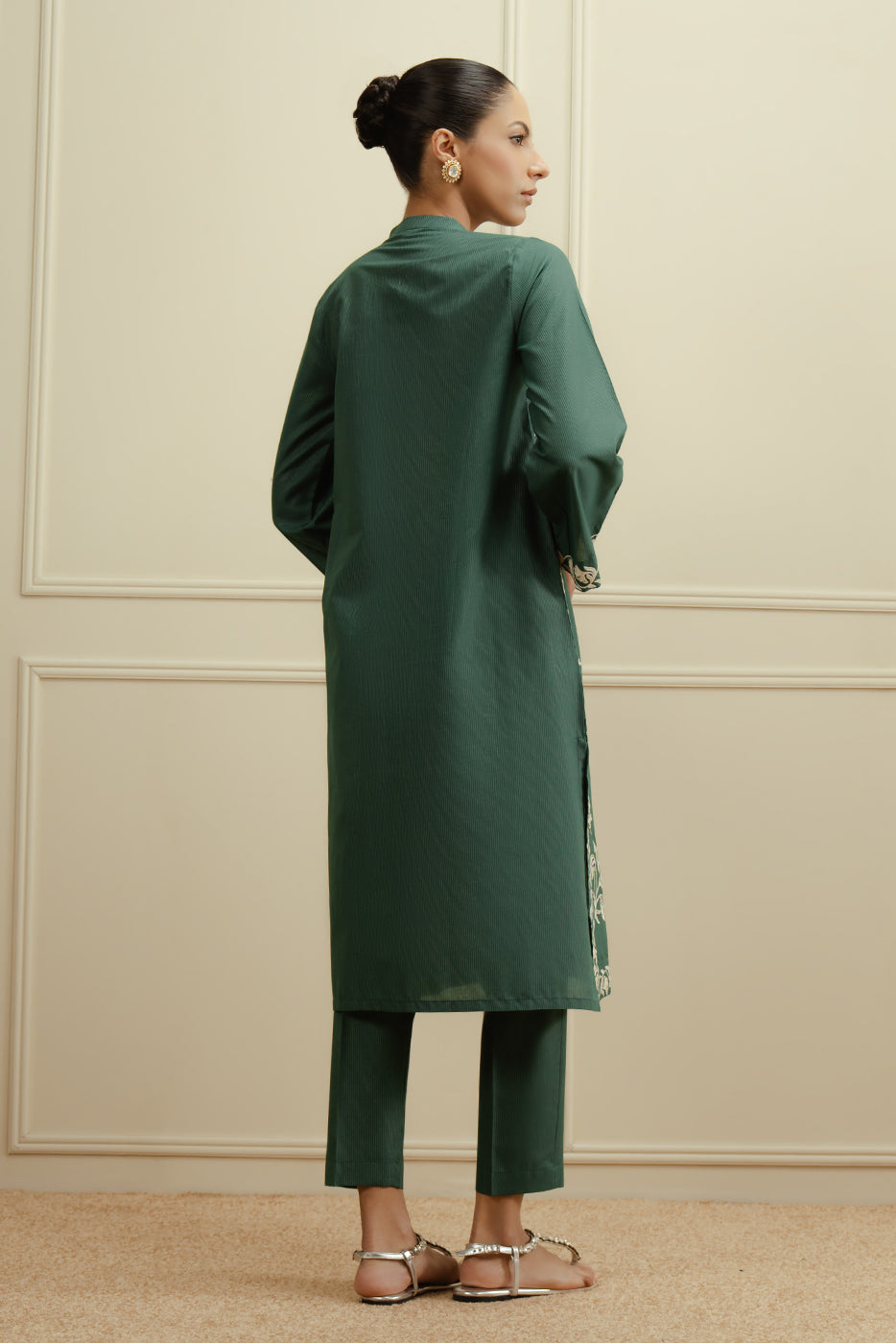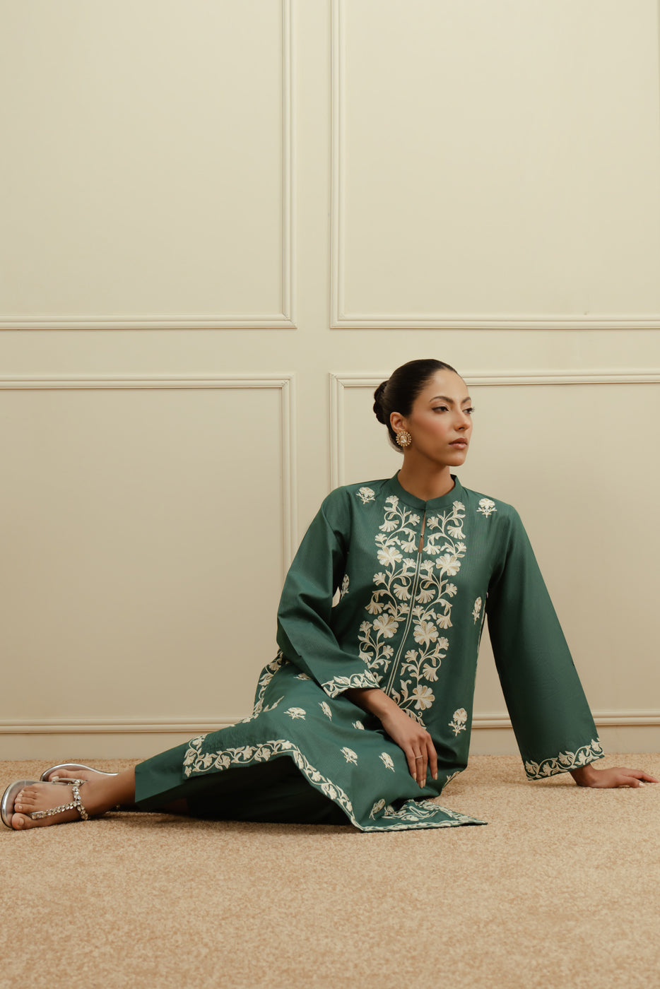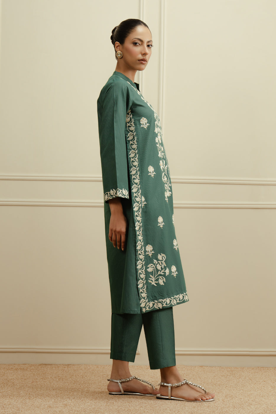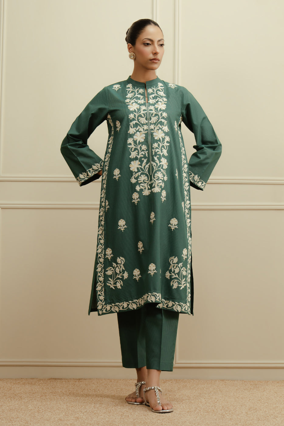 - Description: Embroidered Shirt With Band Collar And Placket, All Over Detailed Aari Embroidery On Front And Sleeves. Paired With Straight Pants To Complete The Look.