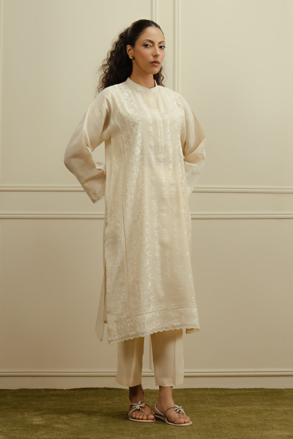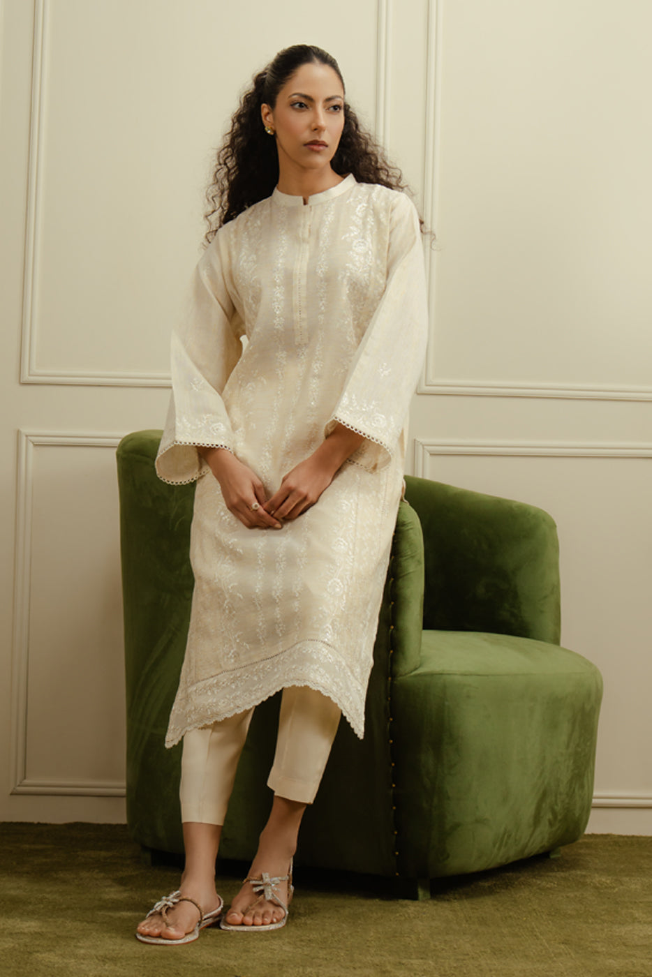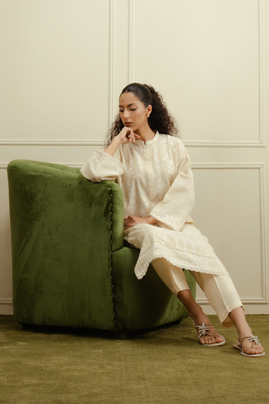 - Description: Embroidered Shirt With Band Collar And Placket With Lace Detail, Embroidery On Front Hem And Sleeves With Laces Inserts.Paired With Straight Pants To Complete The Look.