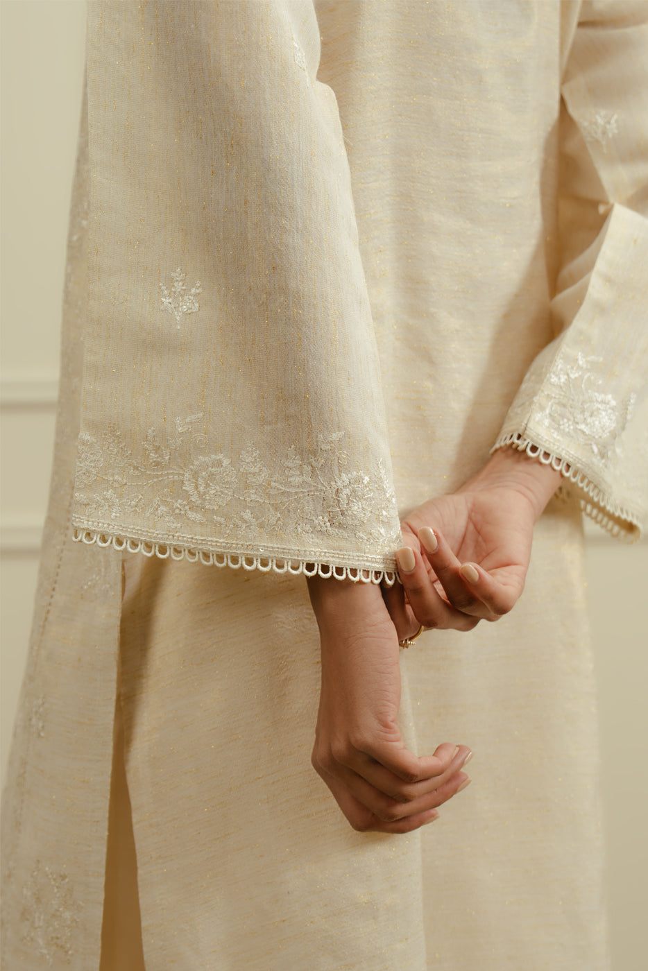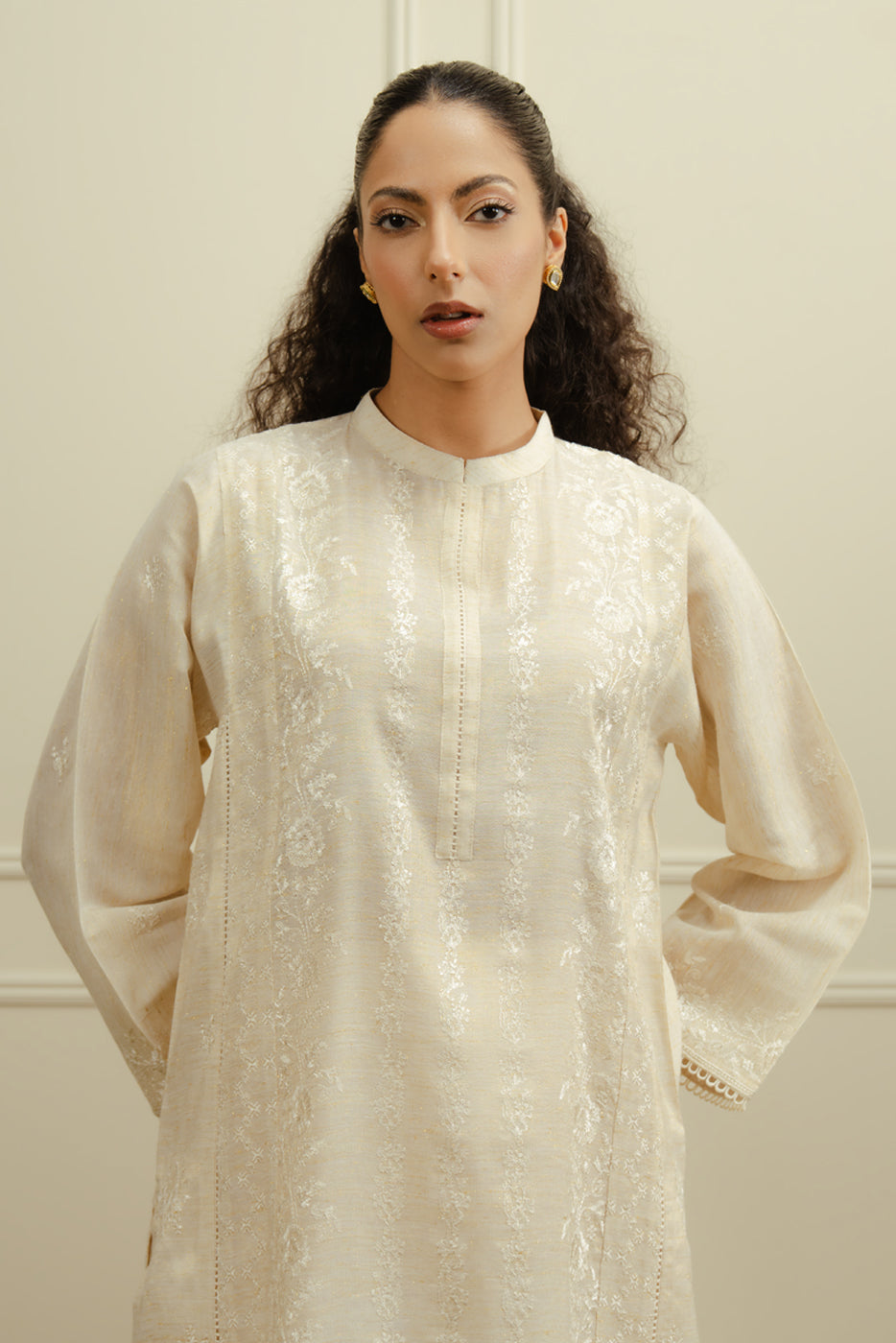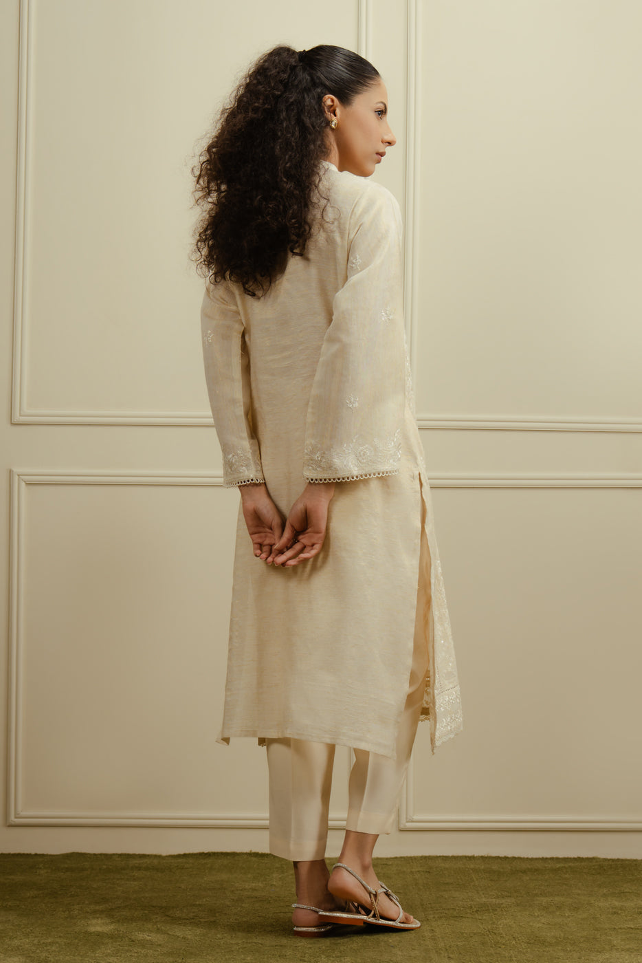 - Description: Embroidered Shirt With Band Collar And Placket With Lace Detail, Embroidery On Front Hem And Sleeves With Laces Inserts.Paired With Straight Pants To Complete The Look.