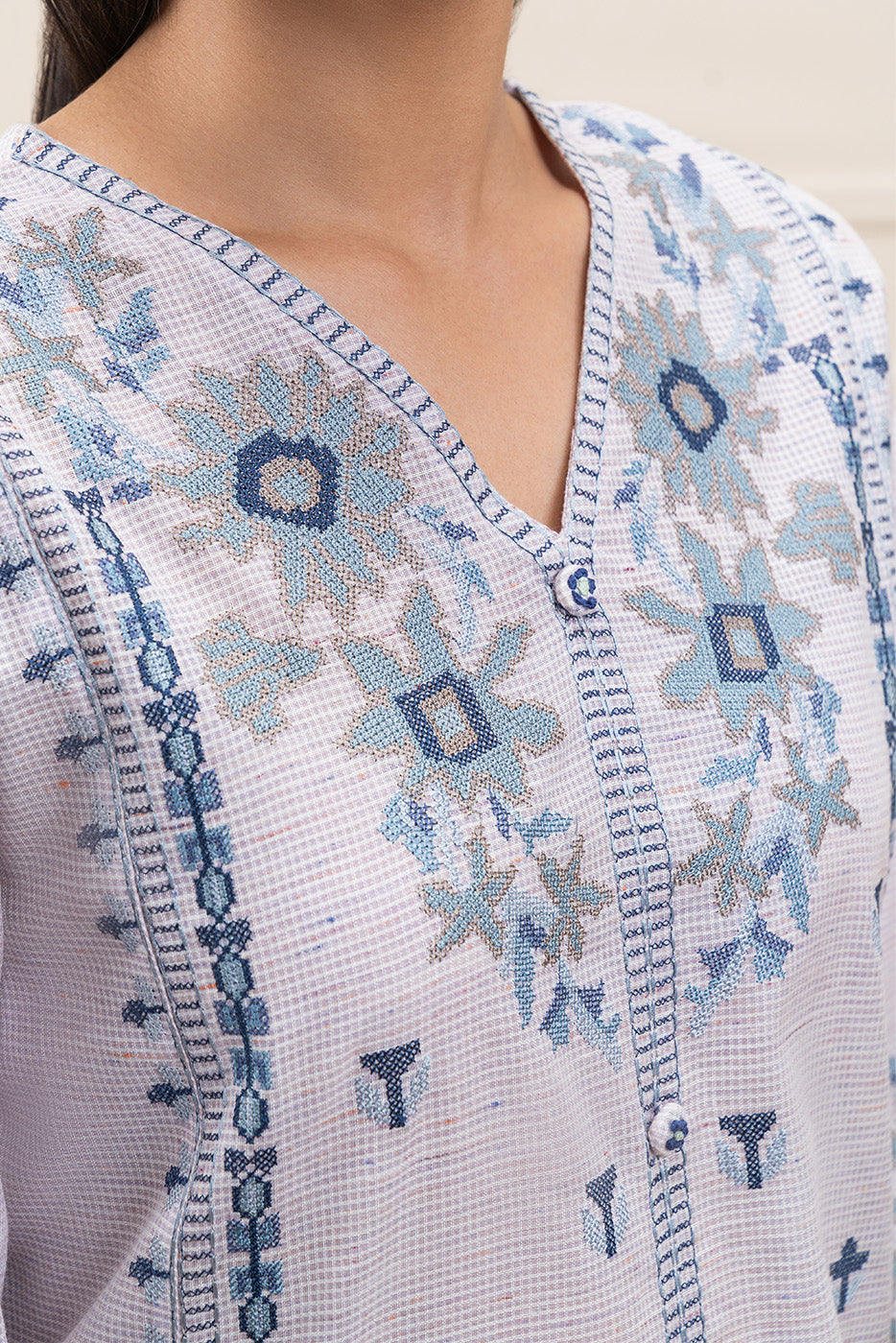 - Description: Crossstitch Embroidered Shirt . Paired With Culotte Pants And Digital Printed Dupatta