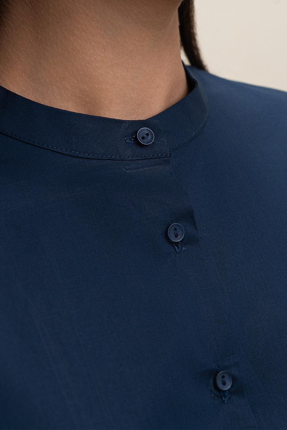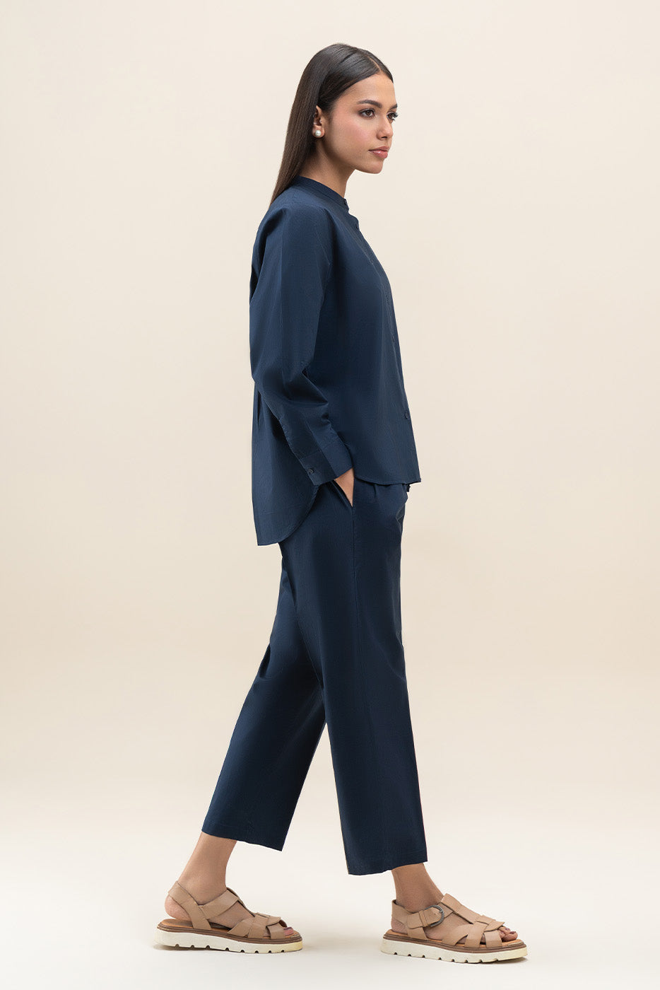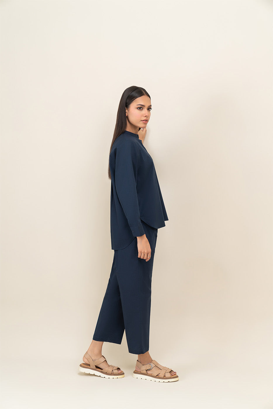 - Description: Solid Coord Set Comprising Of Band Collar Button-Through Shirt With Longer Back Paired With Straight Ankle Length Elasticated Waist Trousers.