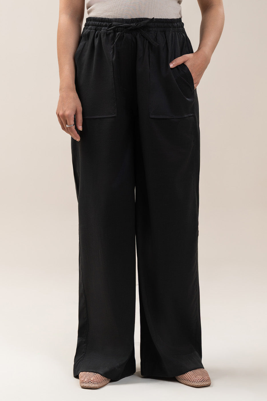 - Description: Twill Wide Leg Trouser With Elasticated Waist, Drawcord Detail, Pleats On Front, Cross Pockets Along With Zipper Fly Opening.