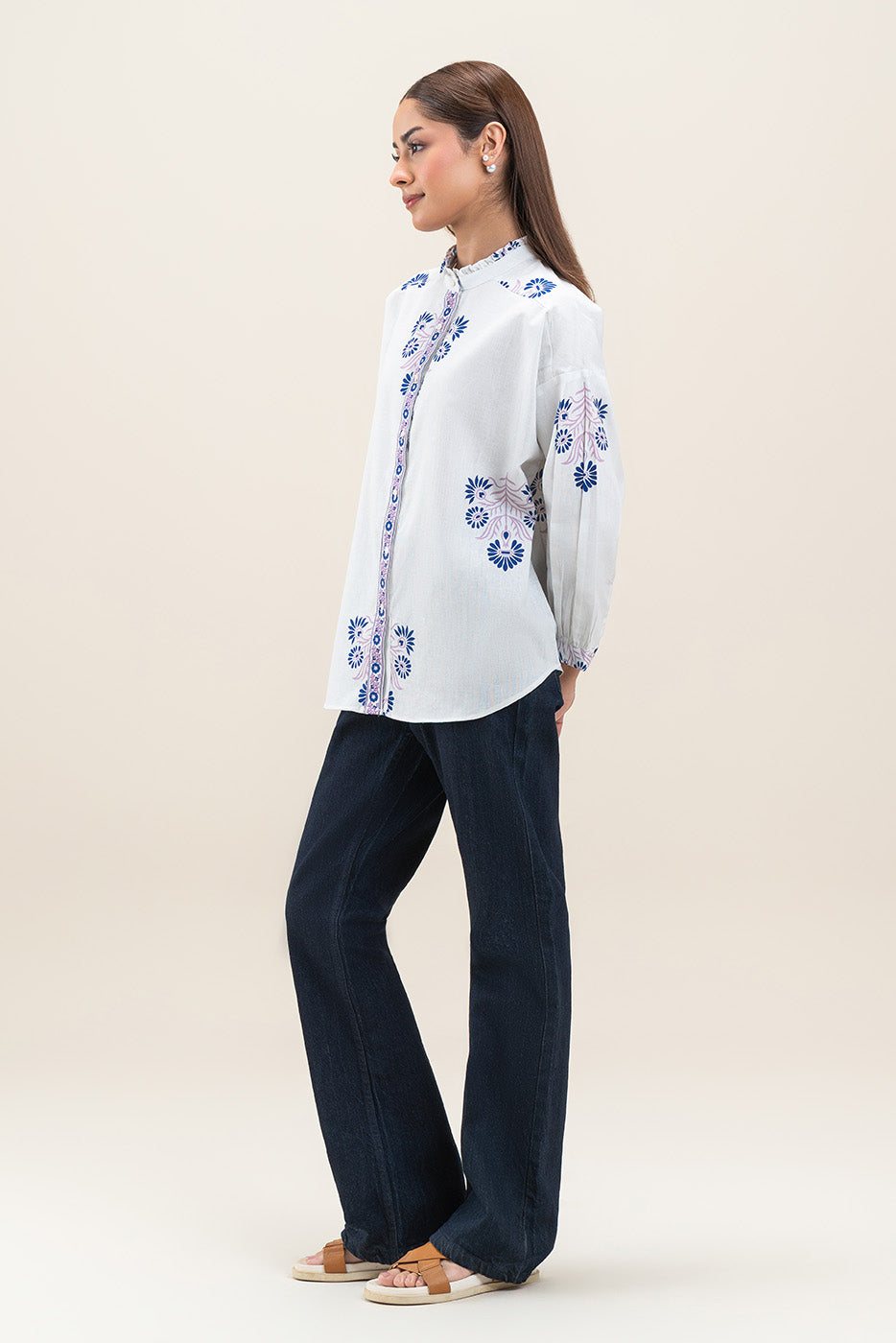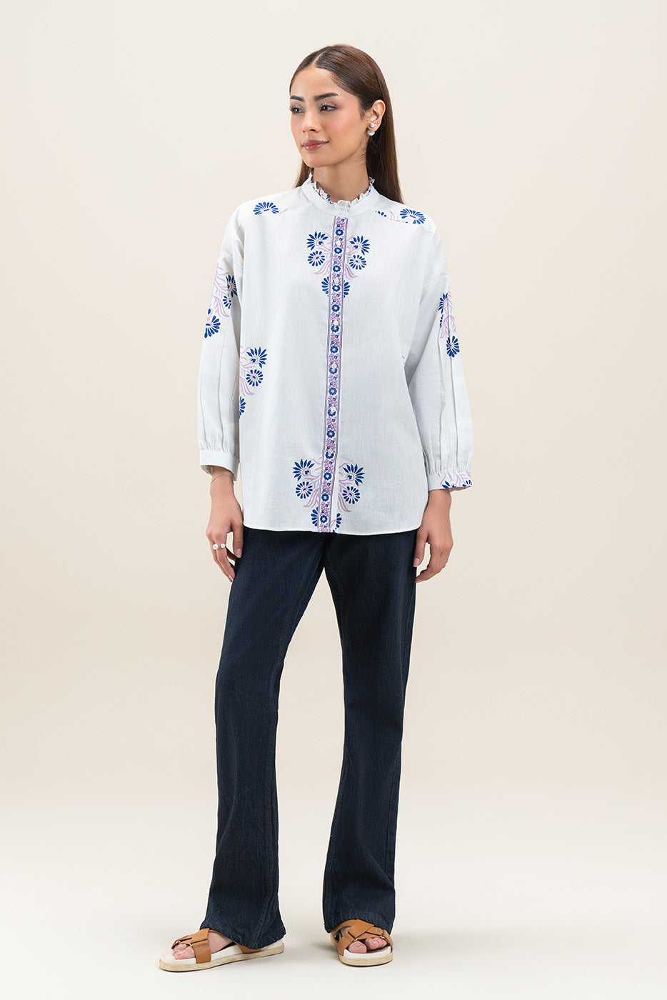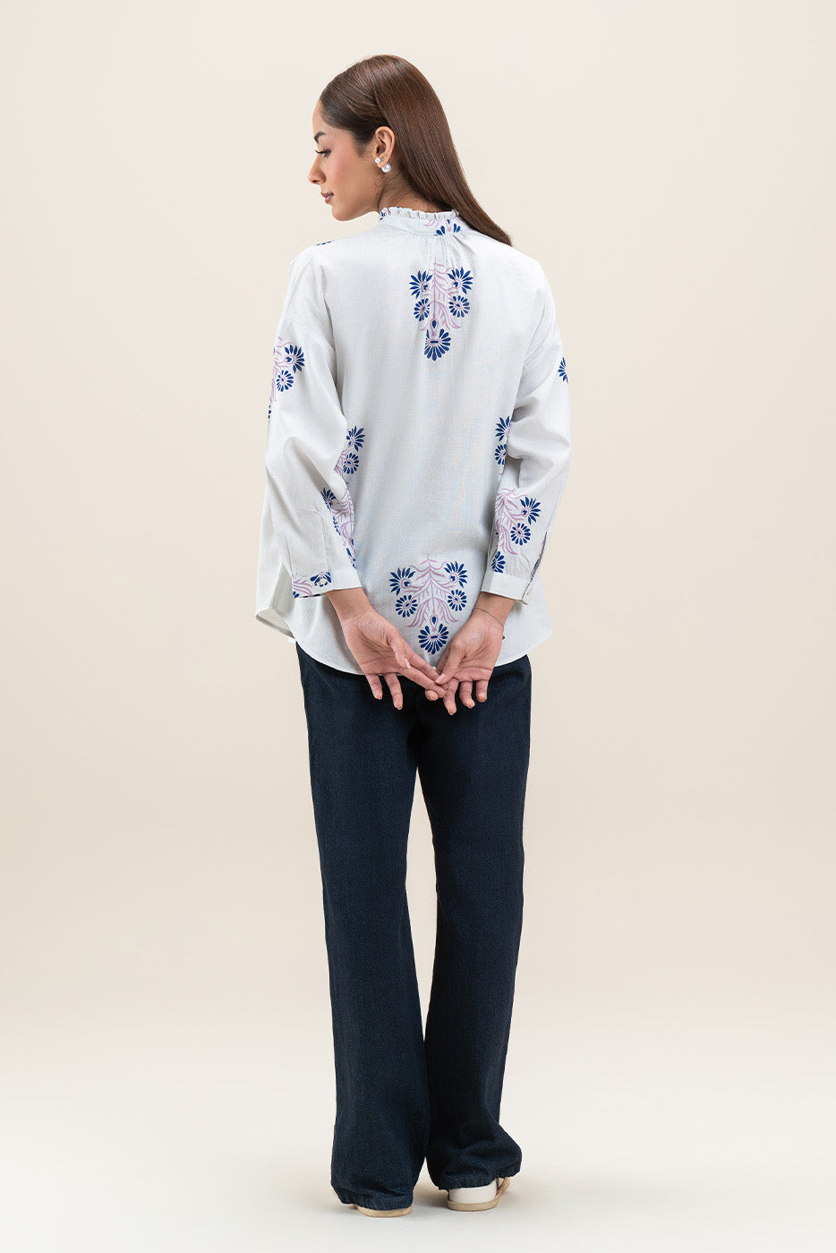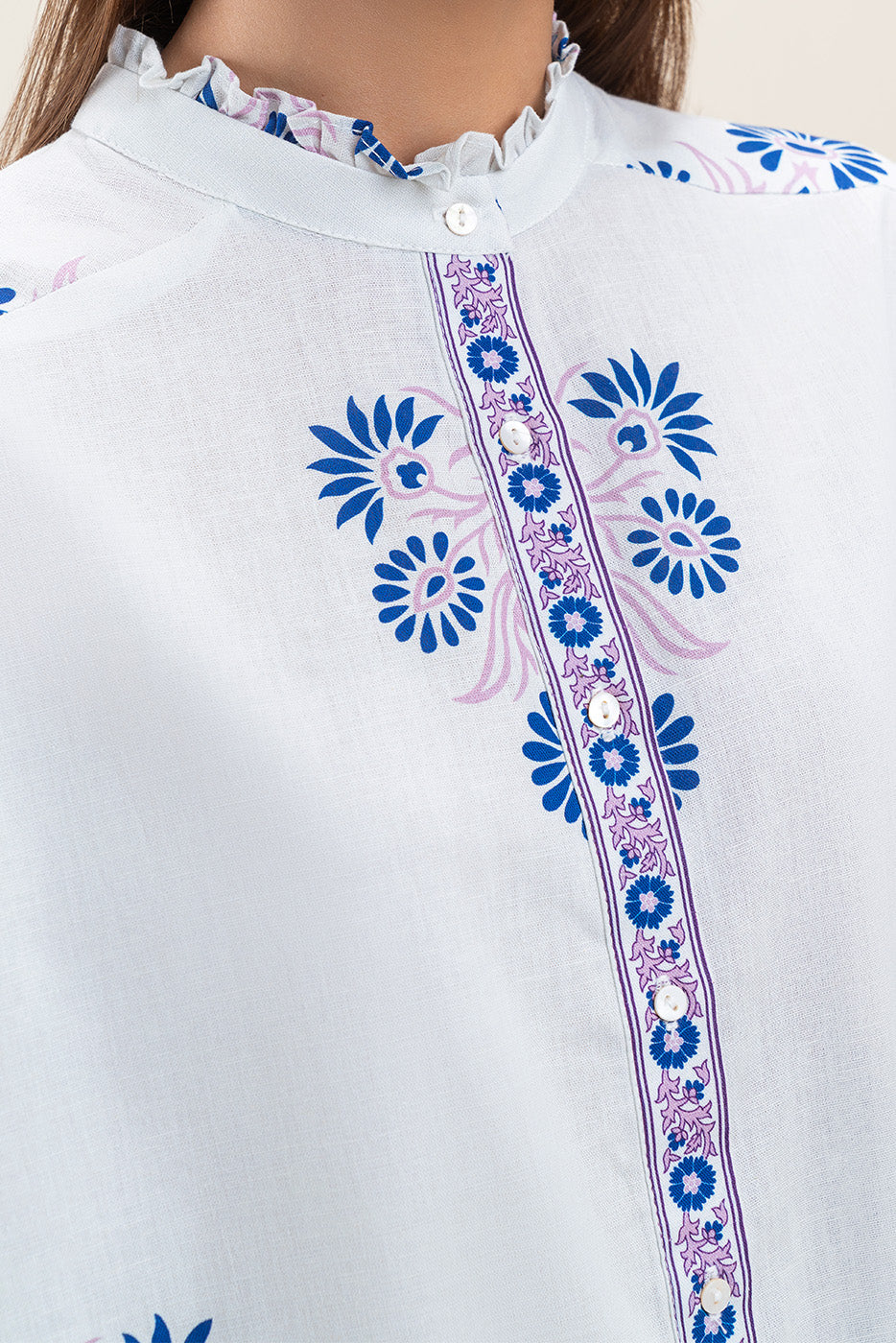 - Description: Printed Band Collar Blouse With Gathers On Sleeve Cuffs, Button-Through Opening Along With Drop Shoulders.