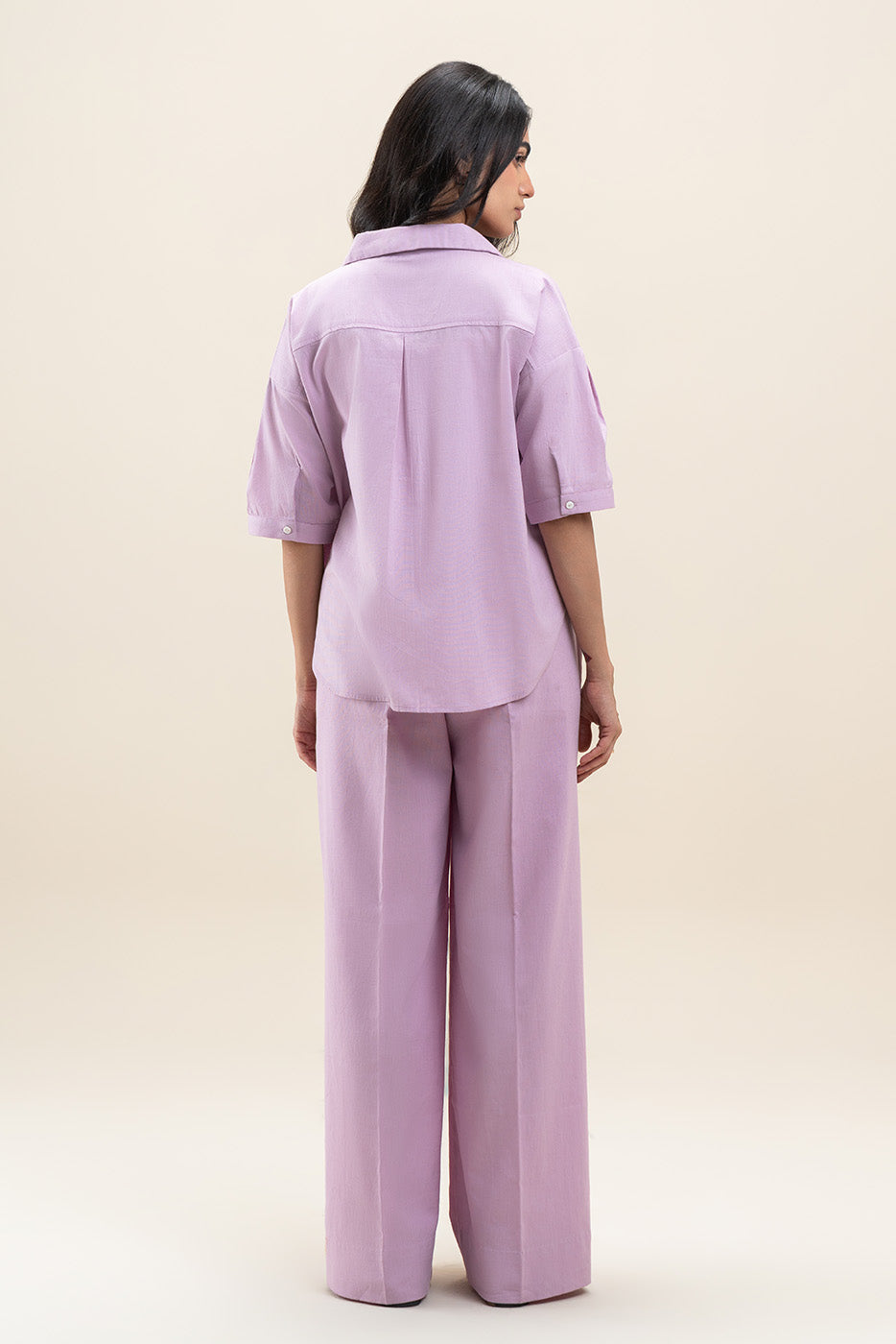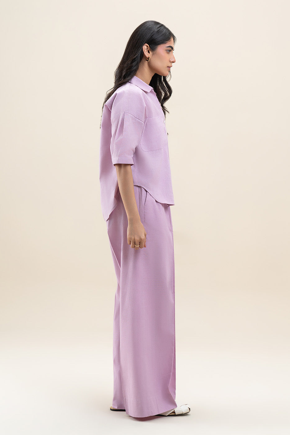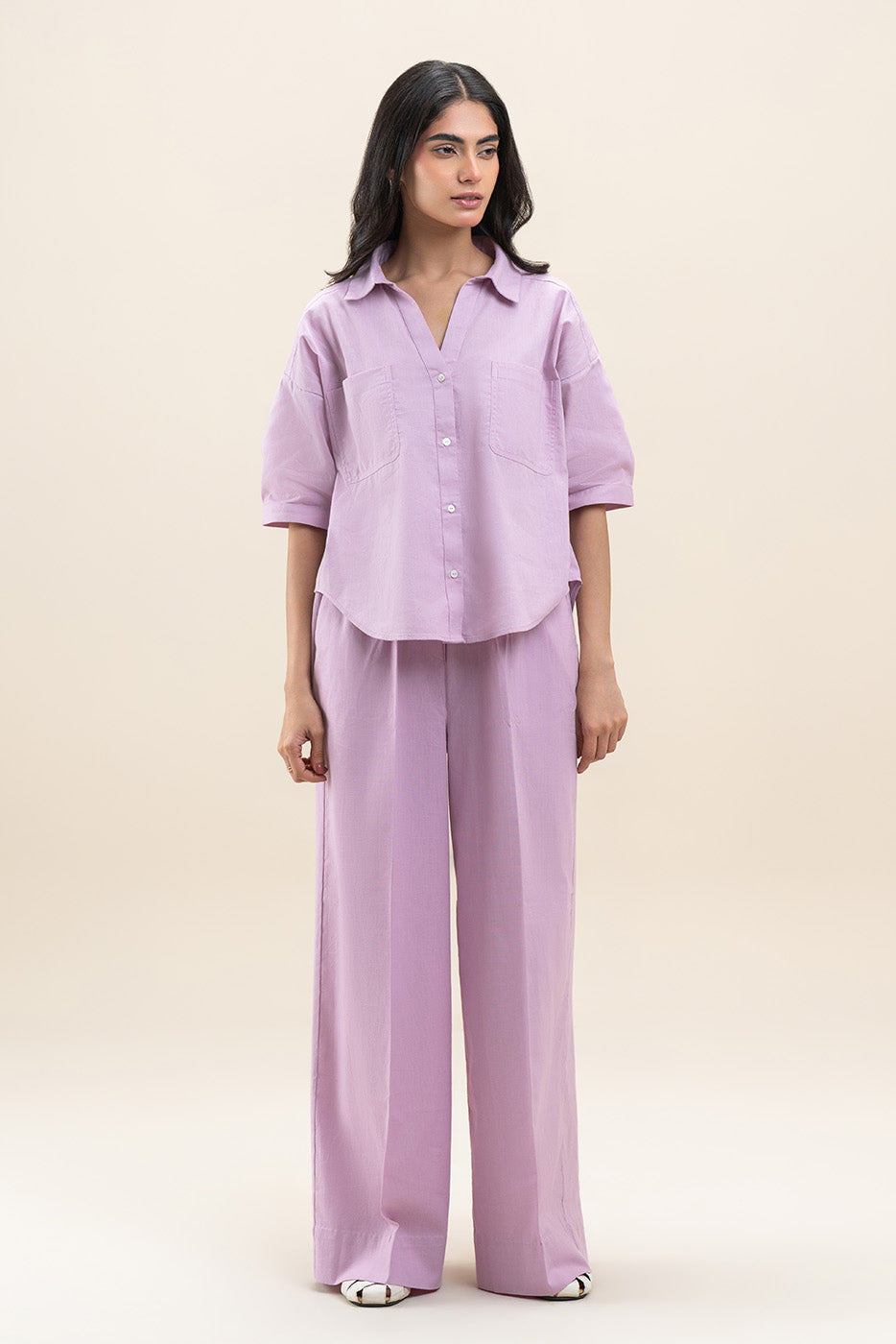 - Description: Solid Coord Set With Button-Though V Neck Collar Top With Patch Pockets Detail Paired With Elasticated Waist Wide Leg Trousers