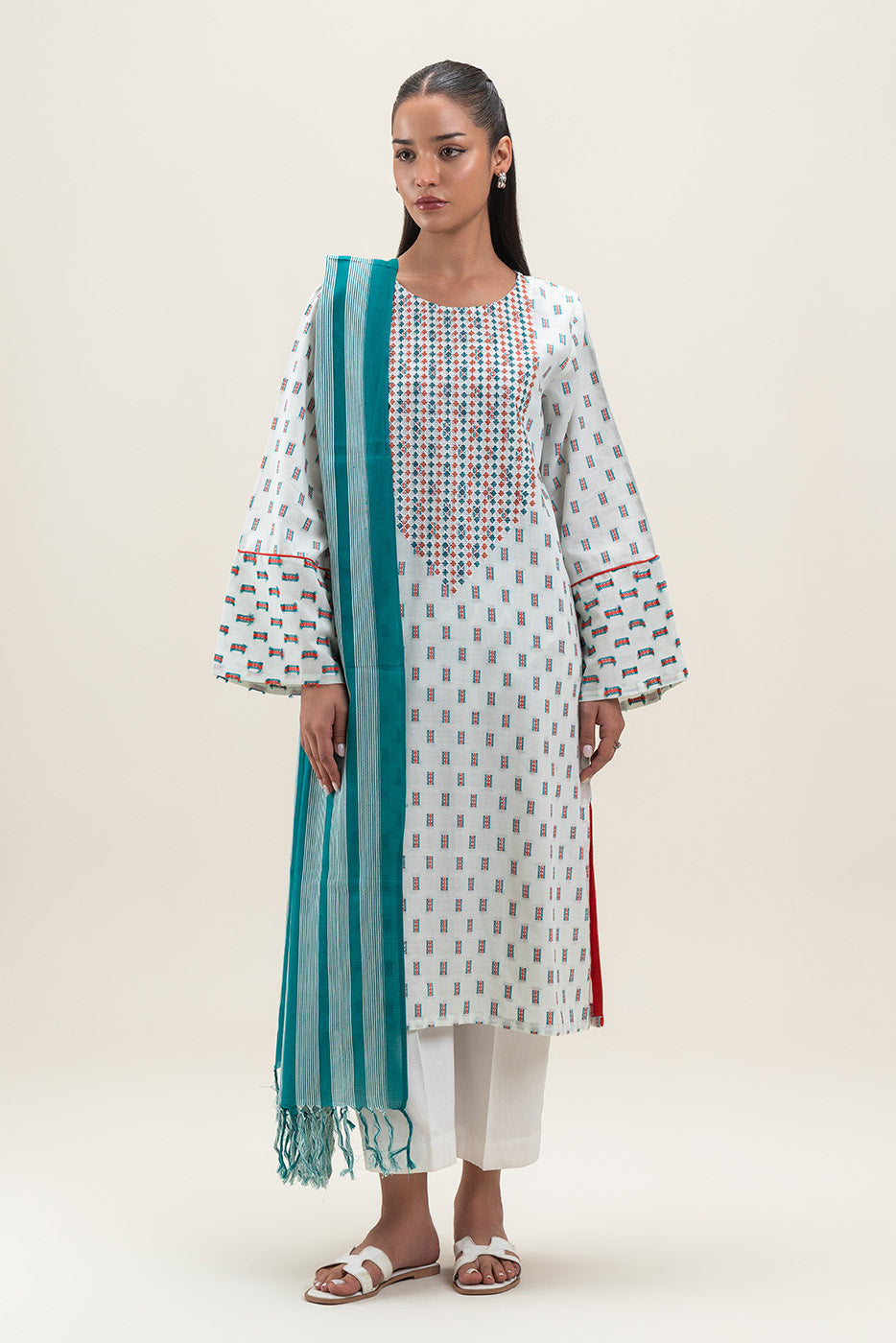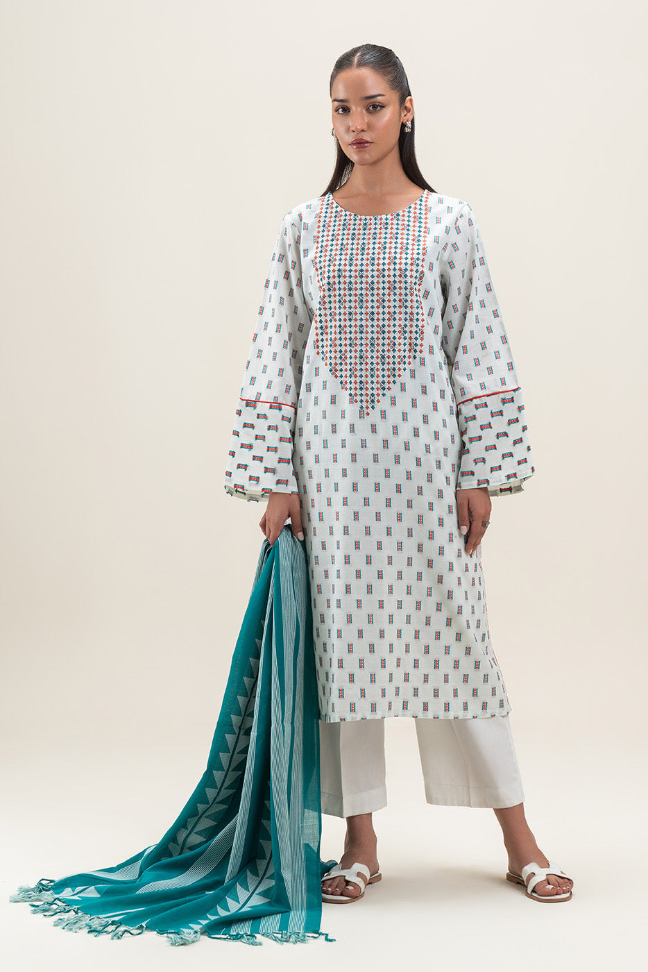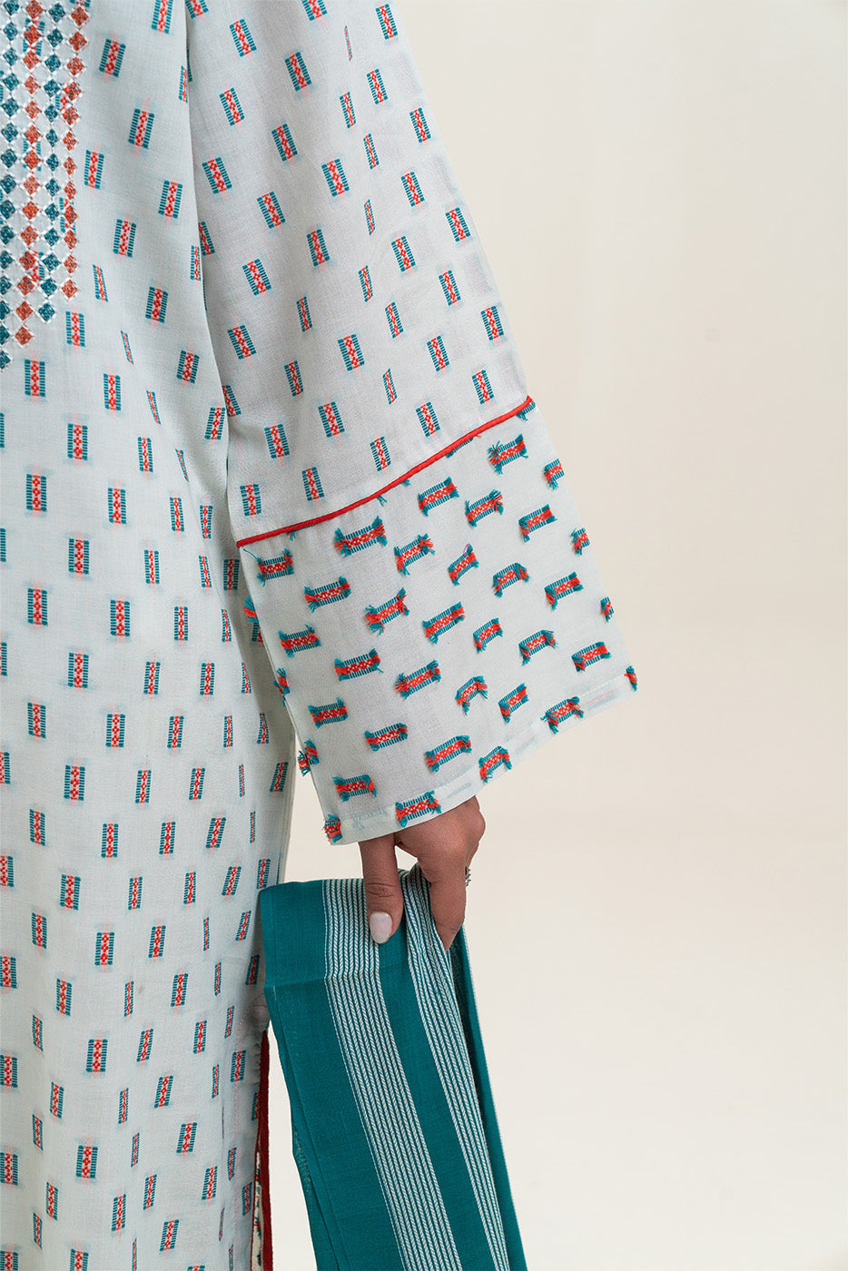 - Description: Embroidered Shirt With Round Neckline And Sleeves With Reverse Jacquard Border And Contrasting Trim Detail. Paired With Contrasting Dupatta To Complete The Look.