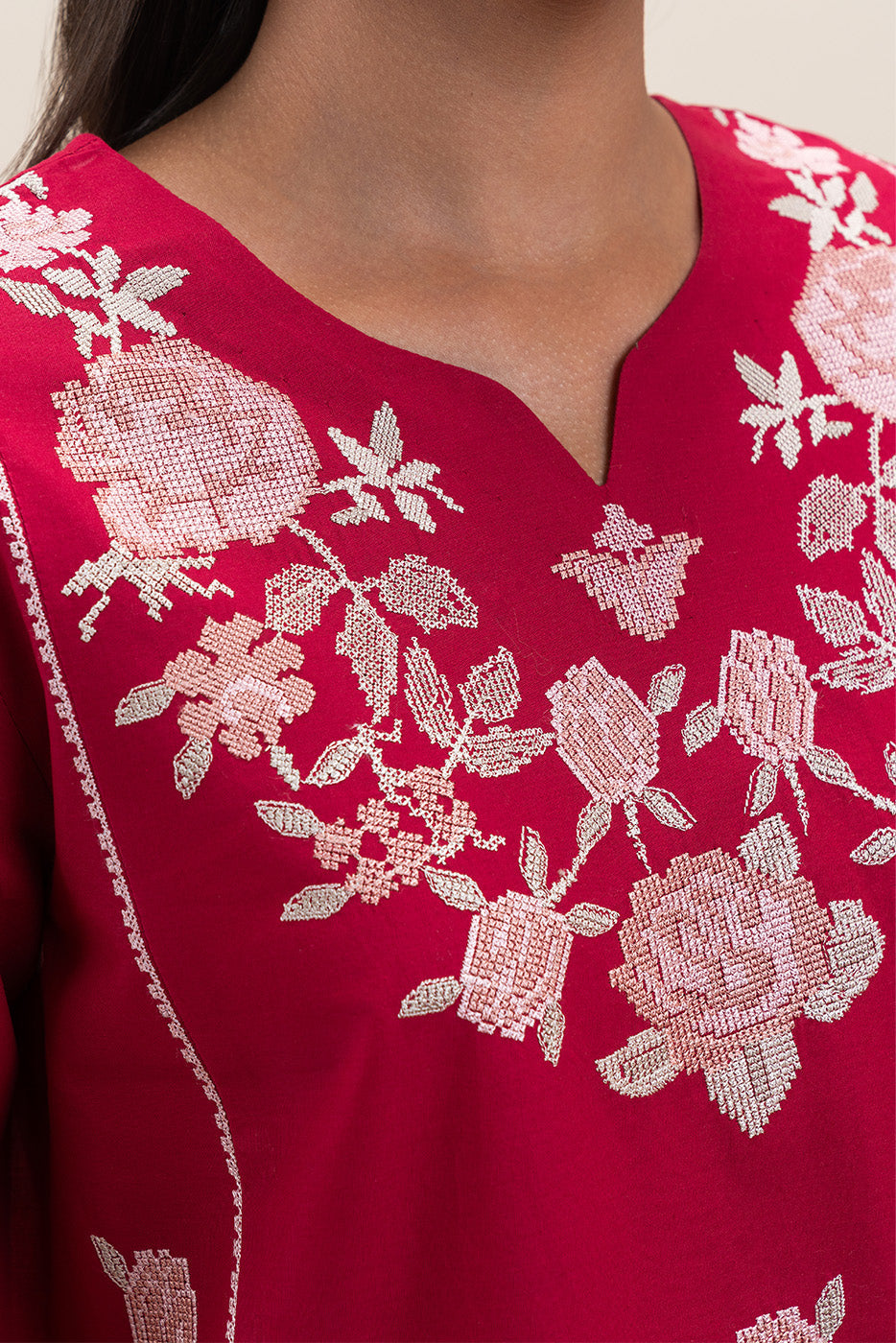 - Description: Floral Crossstitch Embroidered Shirt Paired With Culotte And Printed Dupatta.