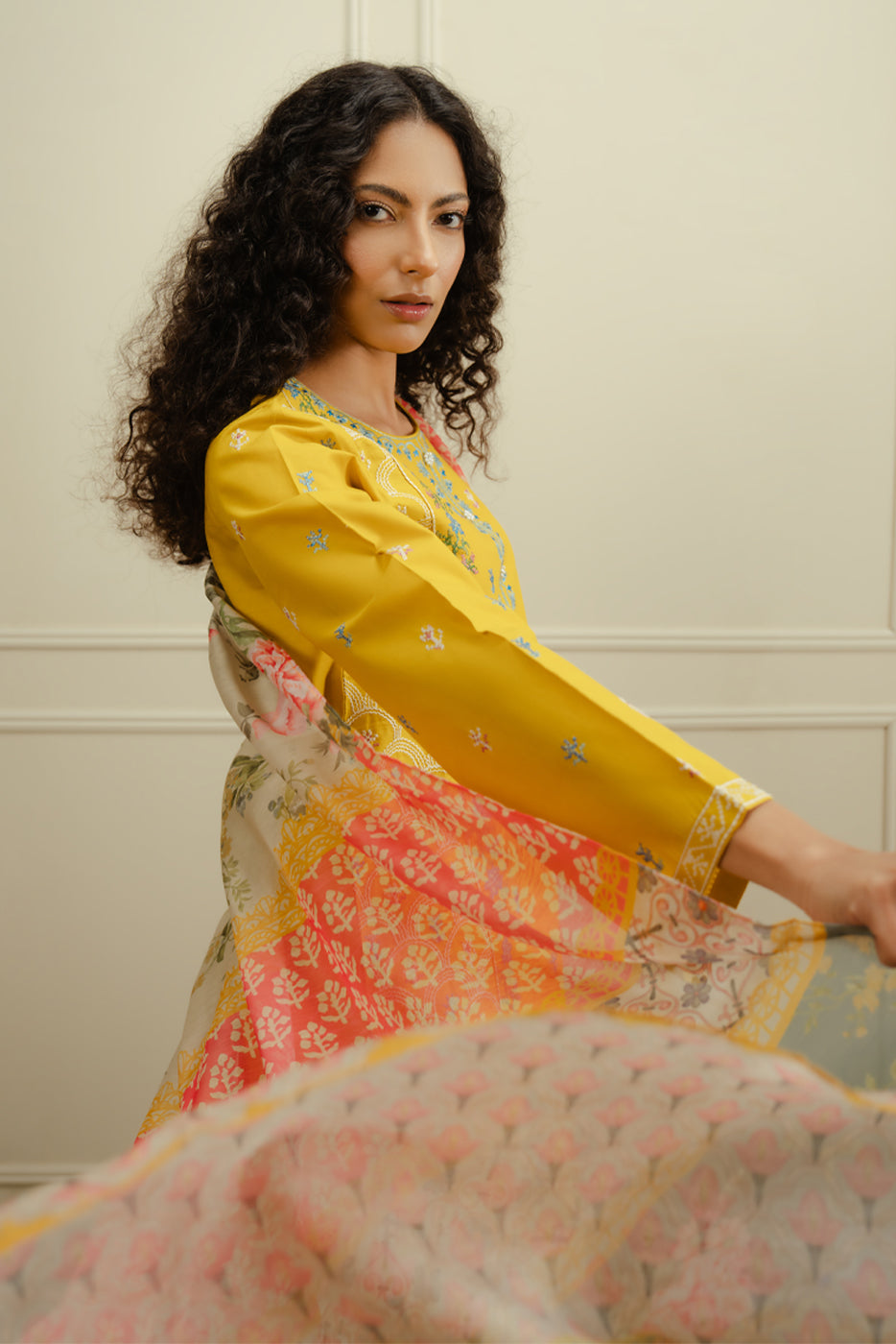 - Description: All Over Embroidered Shirt With Round Neckline And Placket With Handwork Detail. Paired With Culotte Pants And Digital Printed Monark Dupatta To Complete The Look.