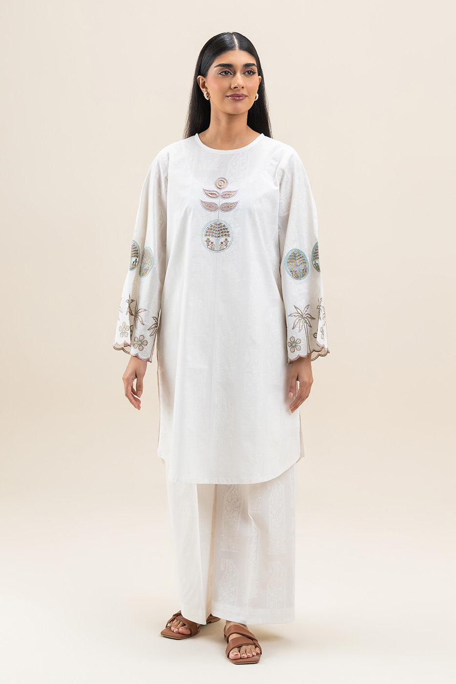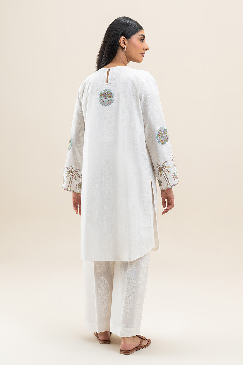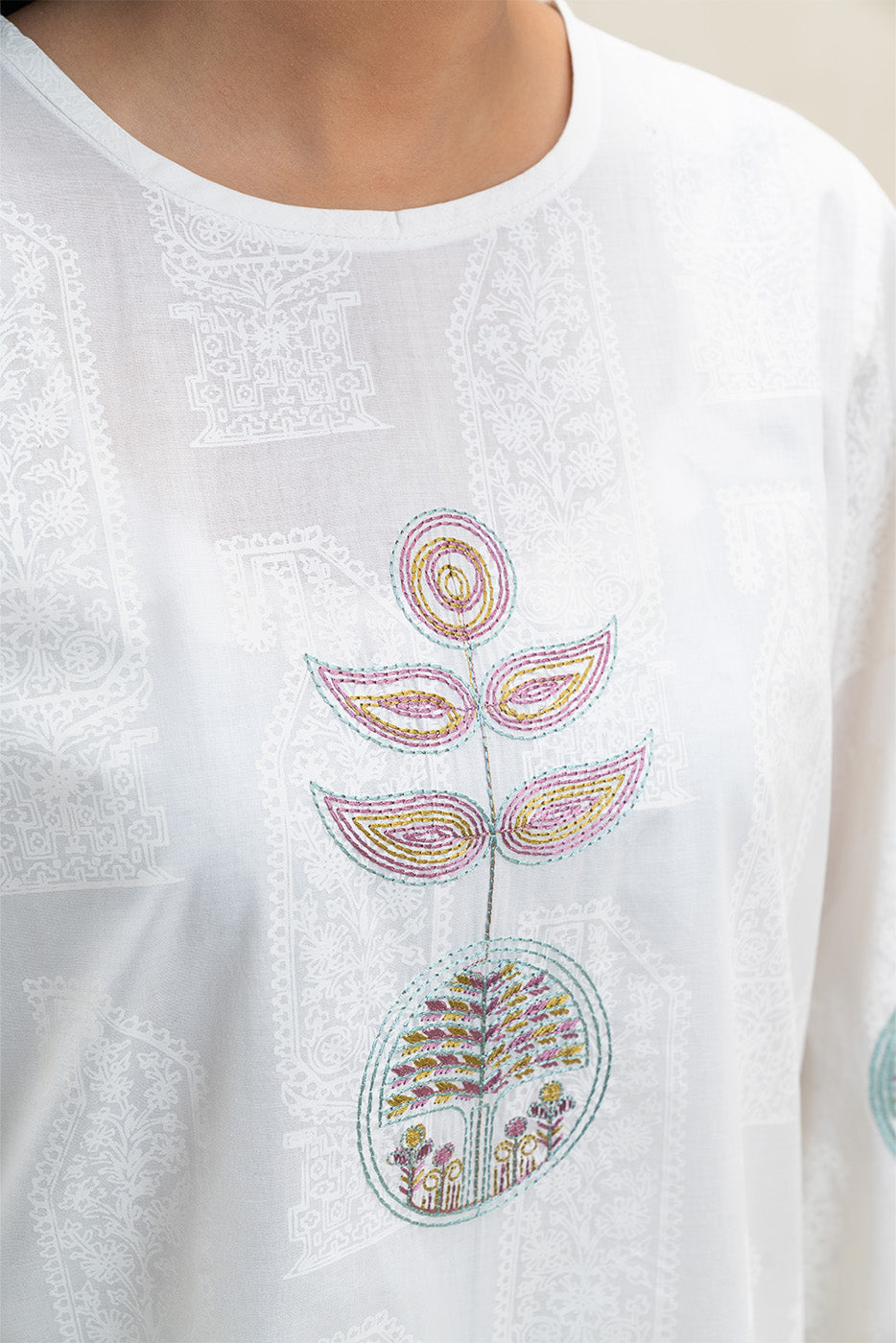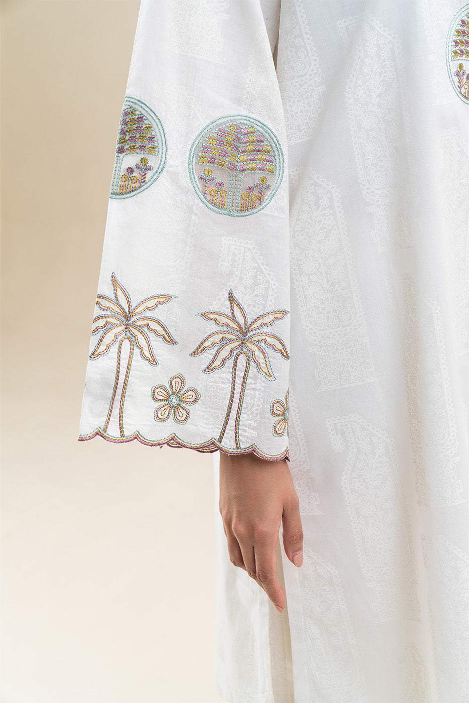 - Description: 2Pc.Embroidered Shirt With Round Neck.Sleeves With Scallops And Embroidered Organza Insertion.Screen Printed Pants.