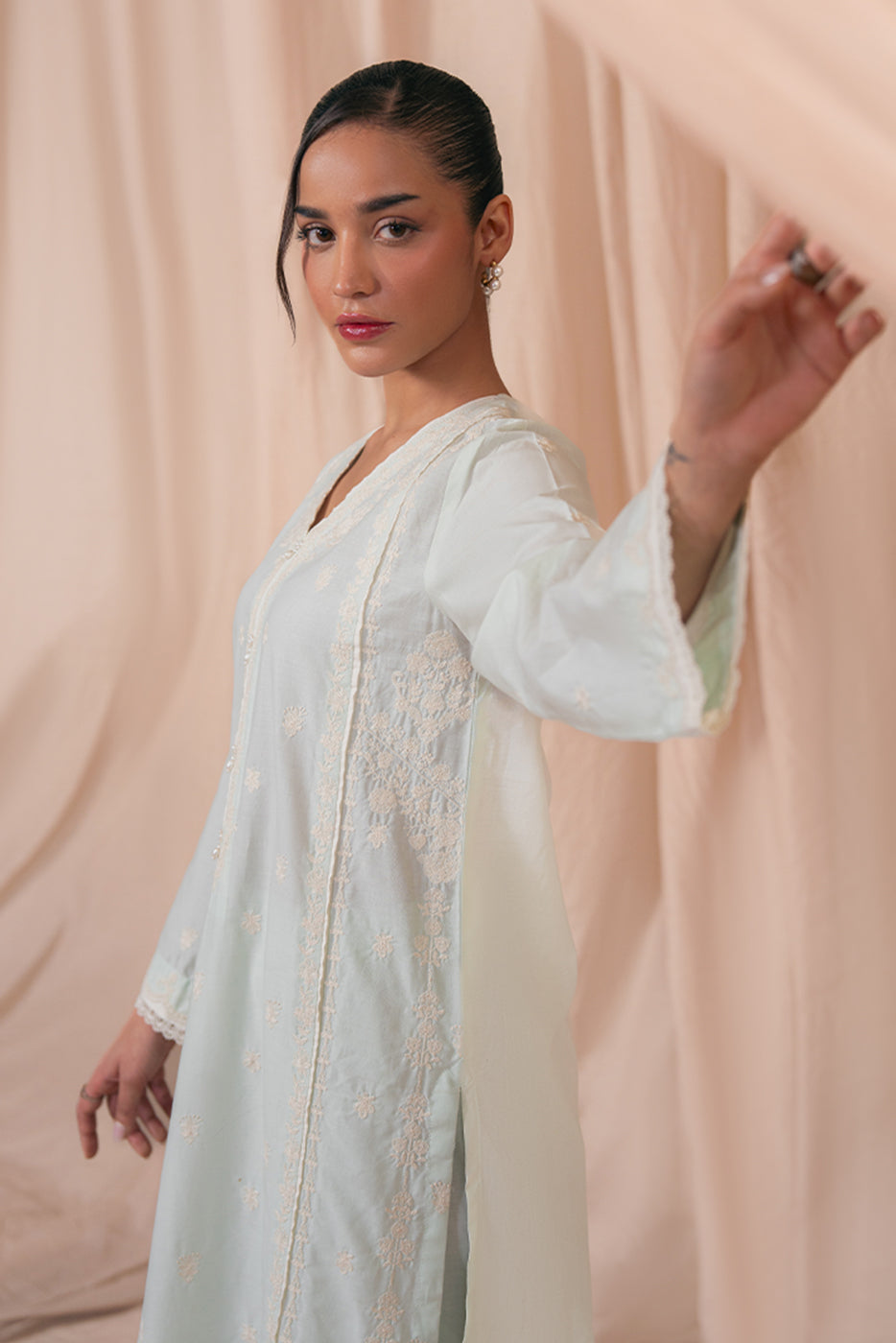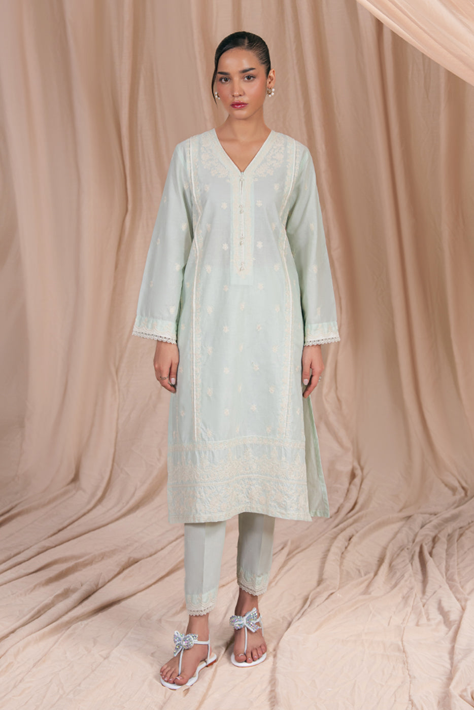 - Description: Embroidered Shirt With Pearl Button Detail On Neckline Paired With Embroidered Straight Trouser.