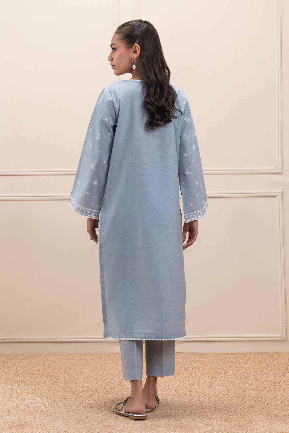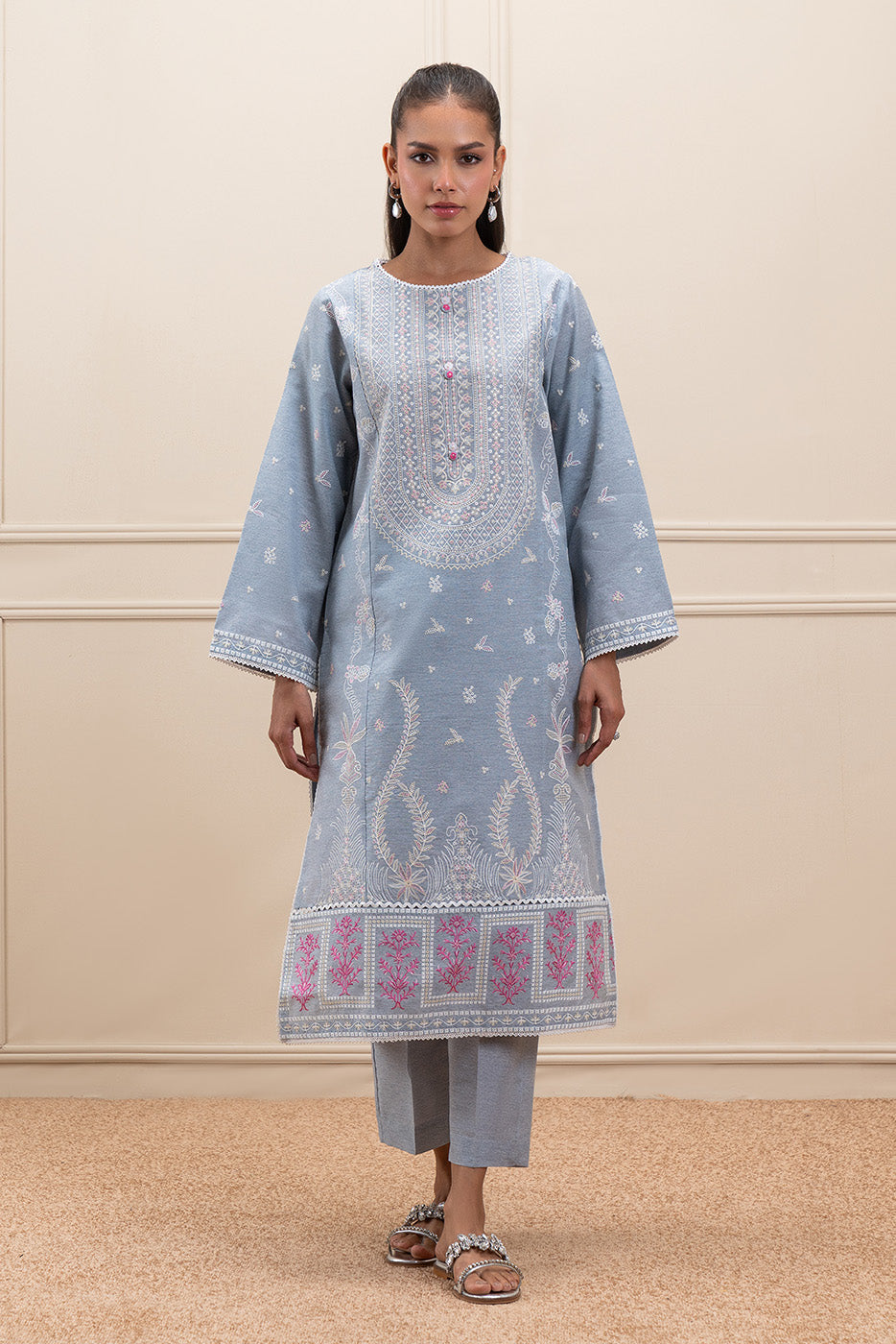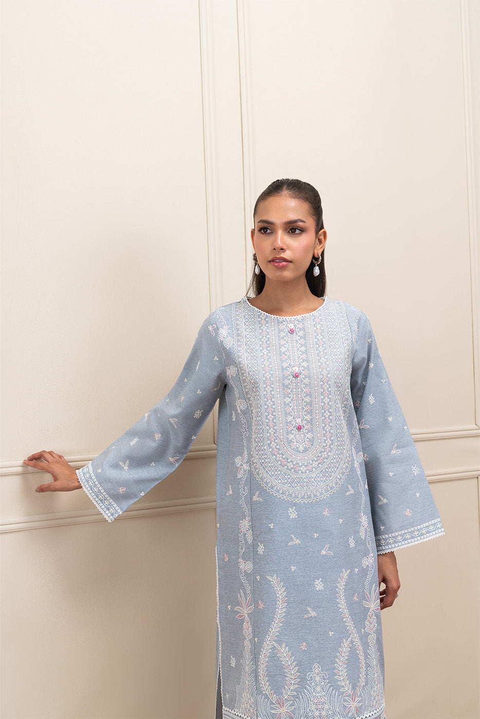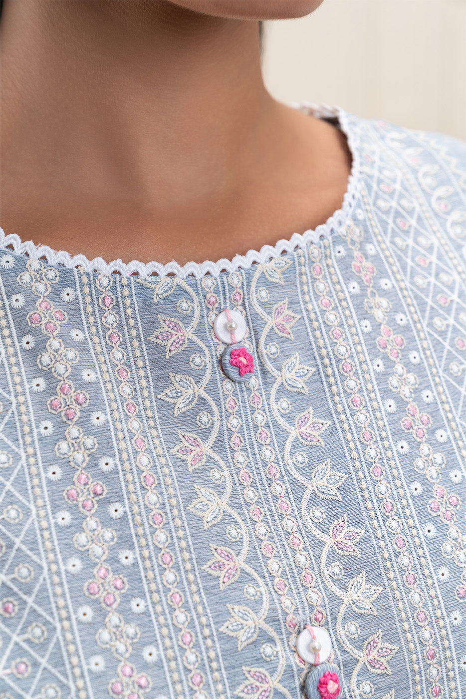 - Description: Embroidered Shirt With Round Neckline And Button Detail, All Over Embroidery On Front And Sleeves With Laces Details. Paired With Straight Pants To Complete The Look.