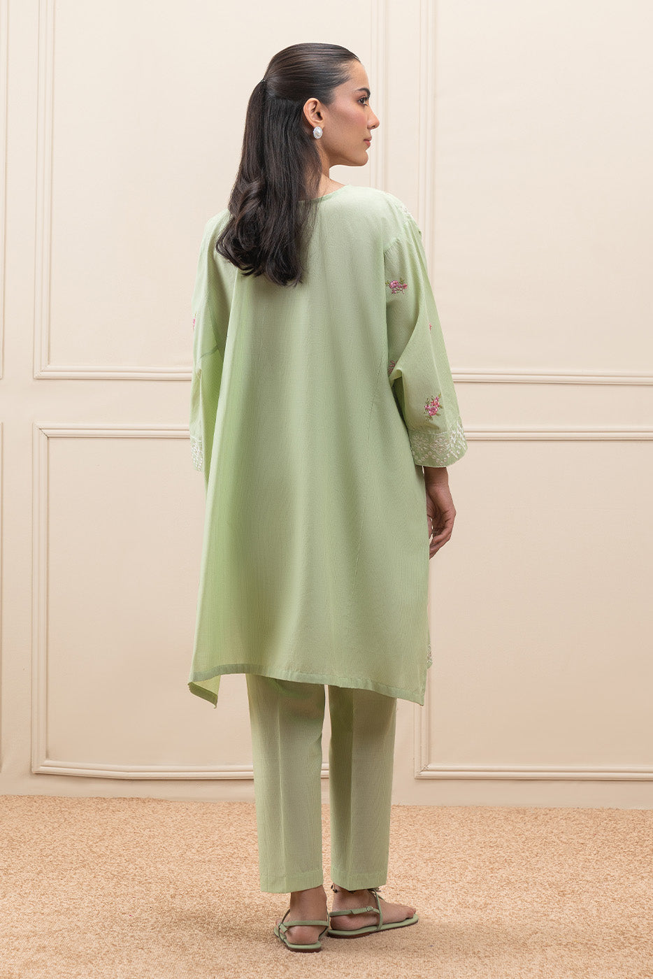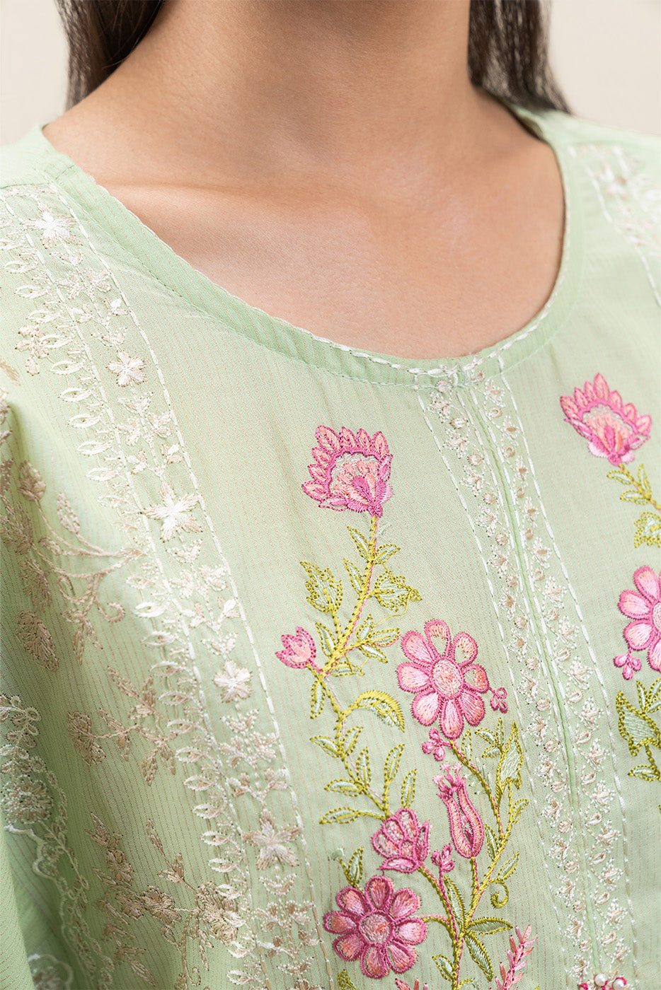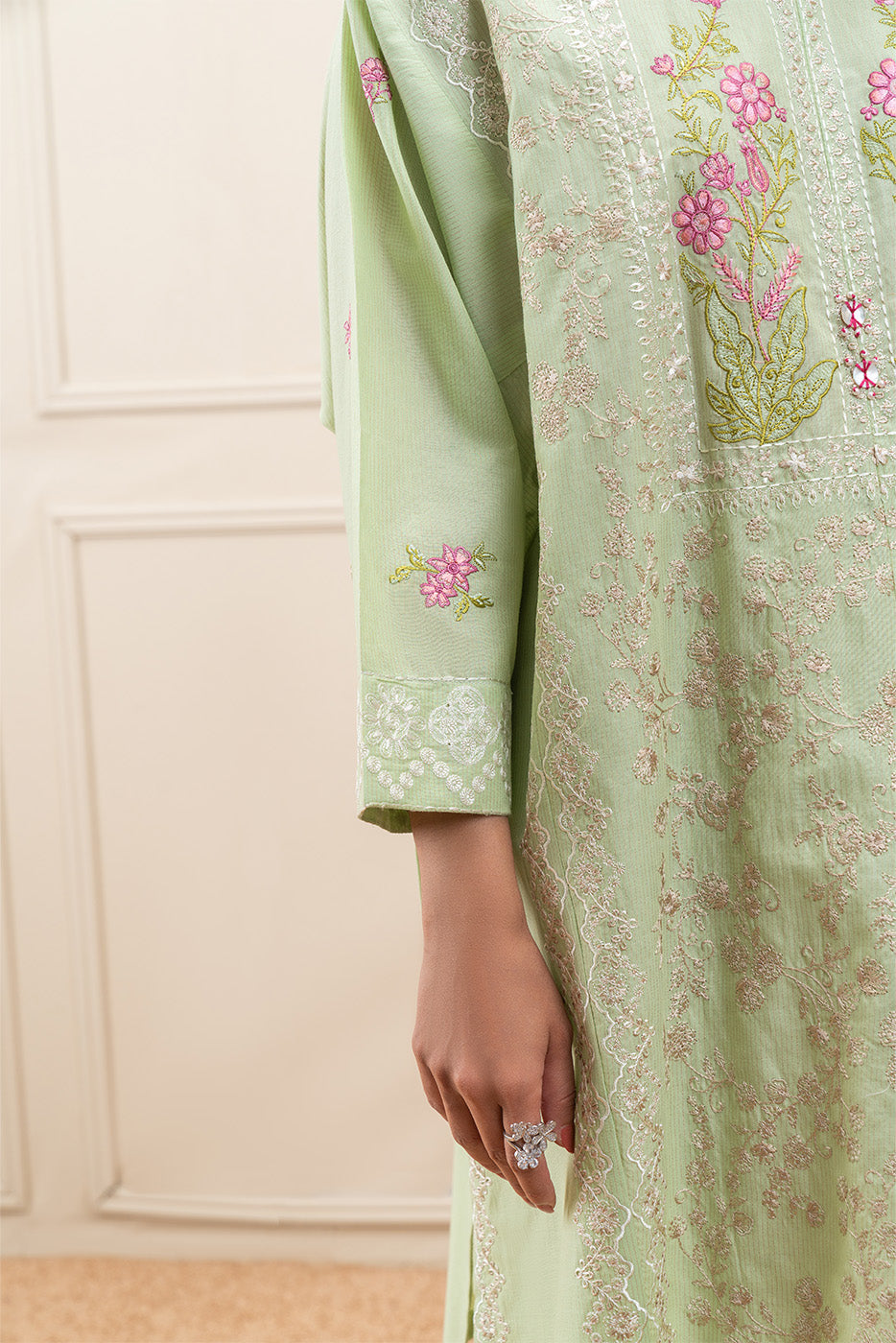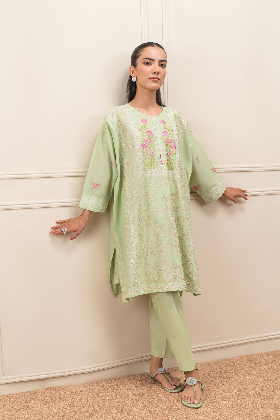 - Description: Embroidered Loose Shirt With Round Neckline And Placket With Handwork Detail. Paired With Straight Trousers To Complete The Look.