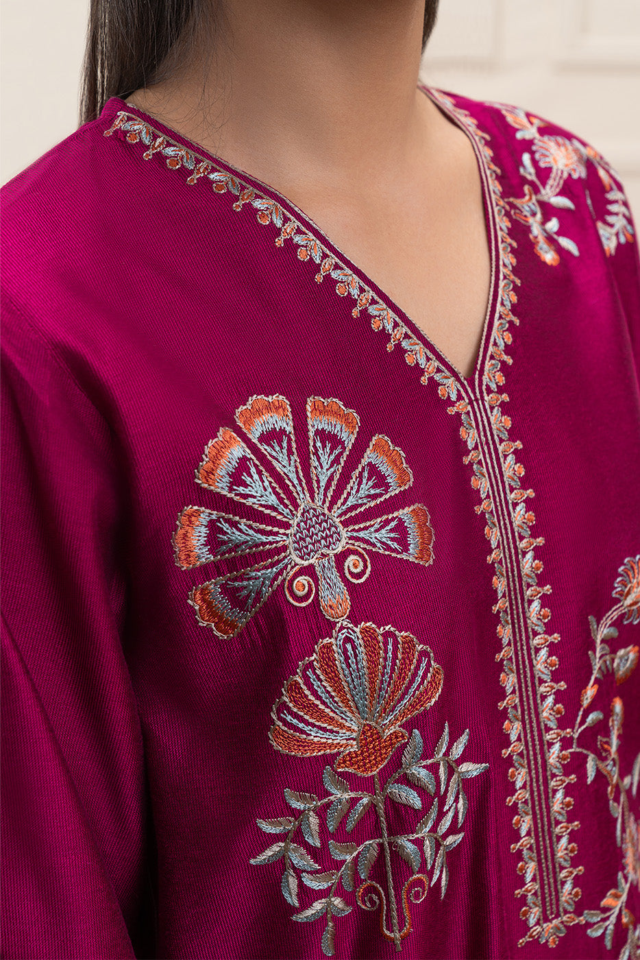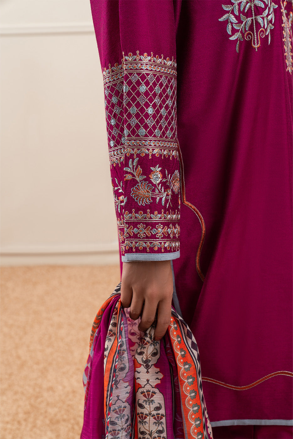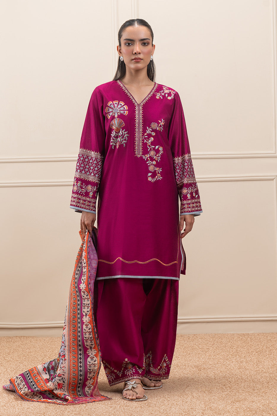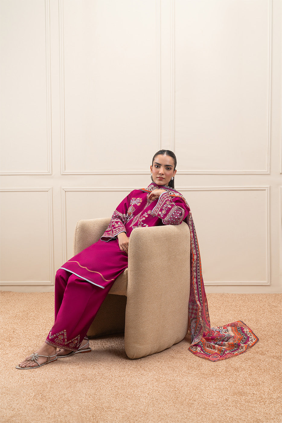 - Description: 3 PCembroidered suit features a short shirt with intricate embroidery on the front and sleeves, providing a touch of elegance. Along with embroidered shalwar adds the perfect complement to the shirt. The digital printed dupatta completes the look.