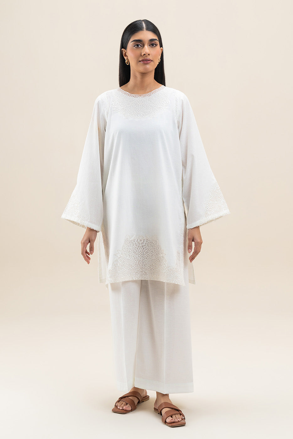 - Description: Embroidered Shirt With Round Neckline And Embroidered Organza Inserts On Neckline , Hem And Sleeves. Paired With Culotte Pants To Complete The Look.
