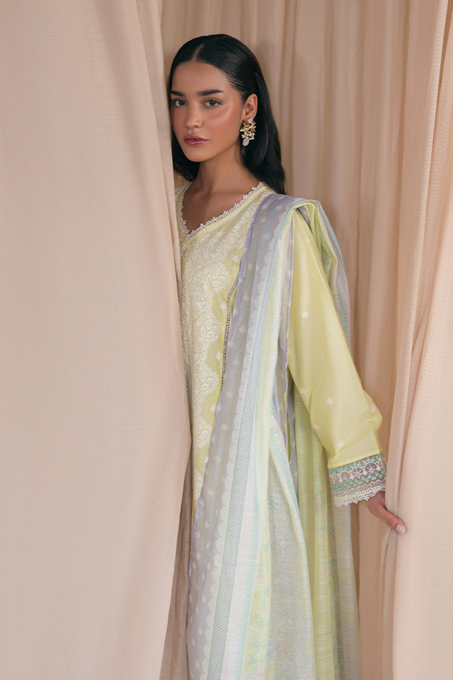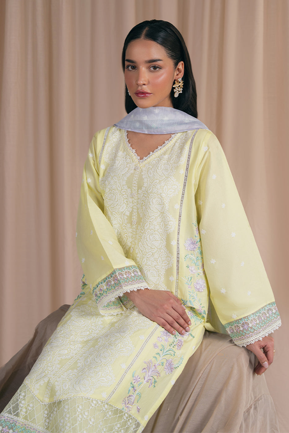 - Description: Embroidered Shirt With V-Neckline With Lace Insert And Handwork Detail, All Over Embroidery On Front And Sleeves With Laces Inserts. Paired With Culotte Pants And Digital Printed Dupatta To Complet The Look.