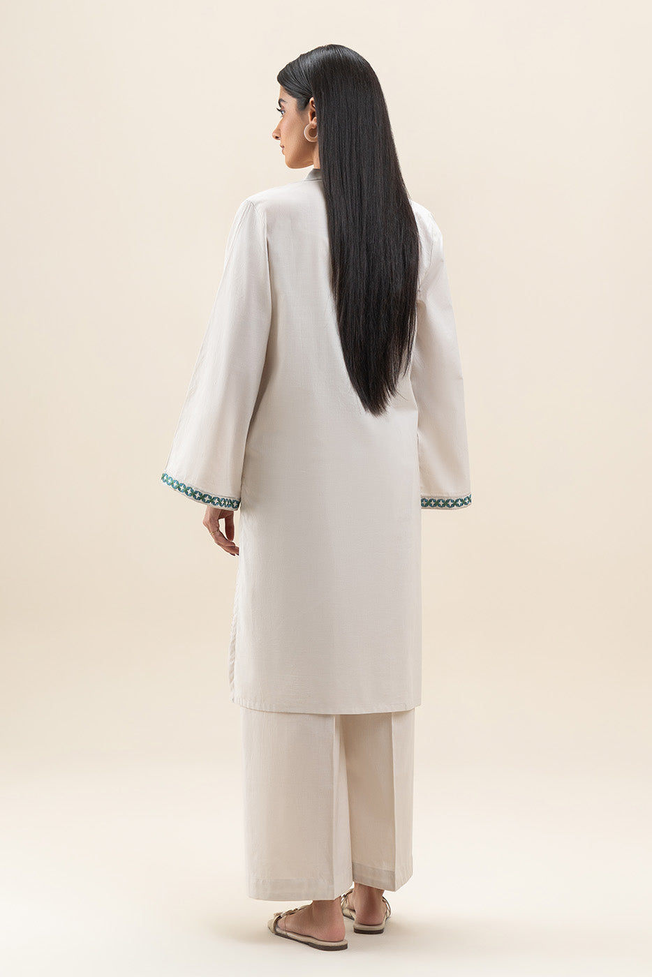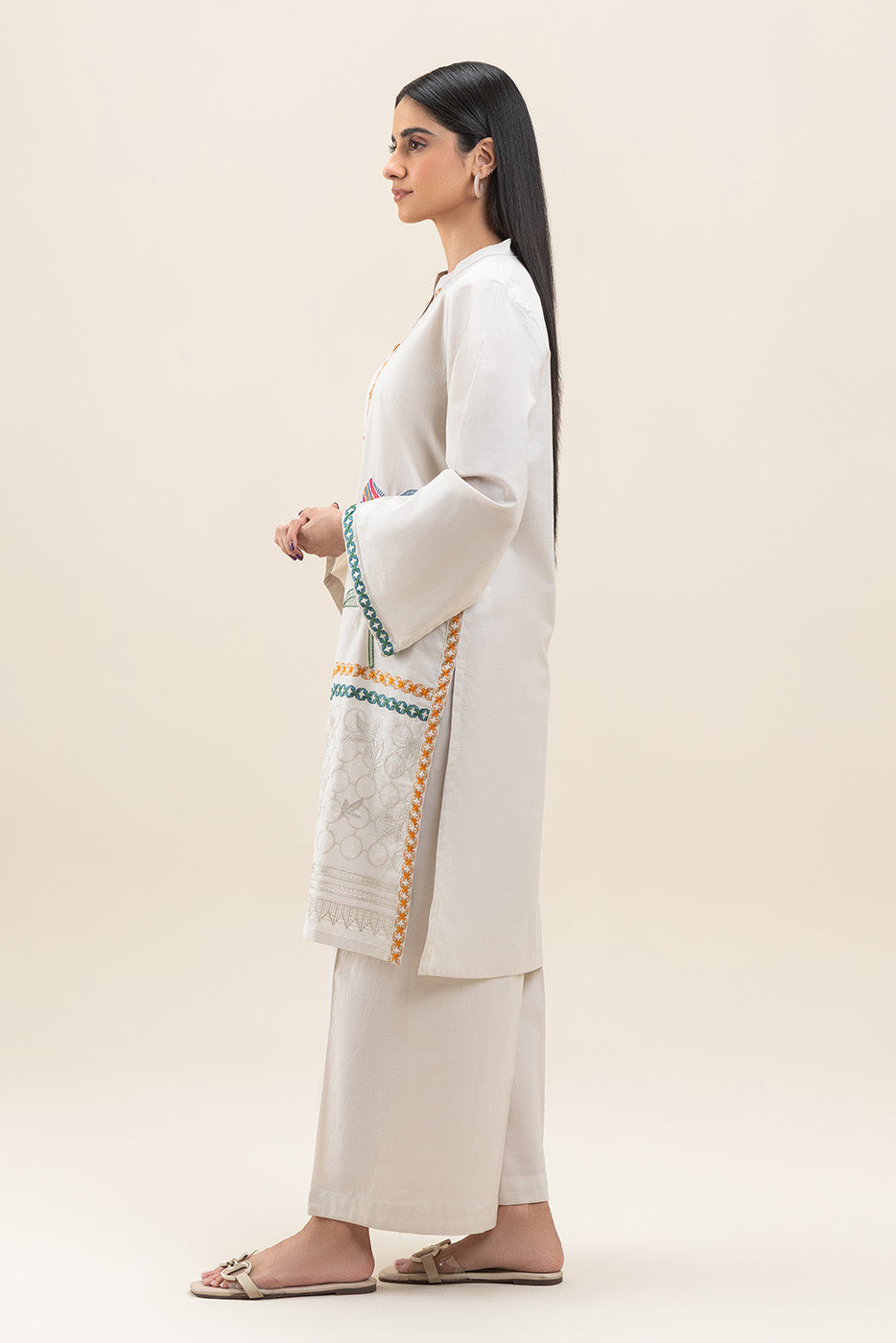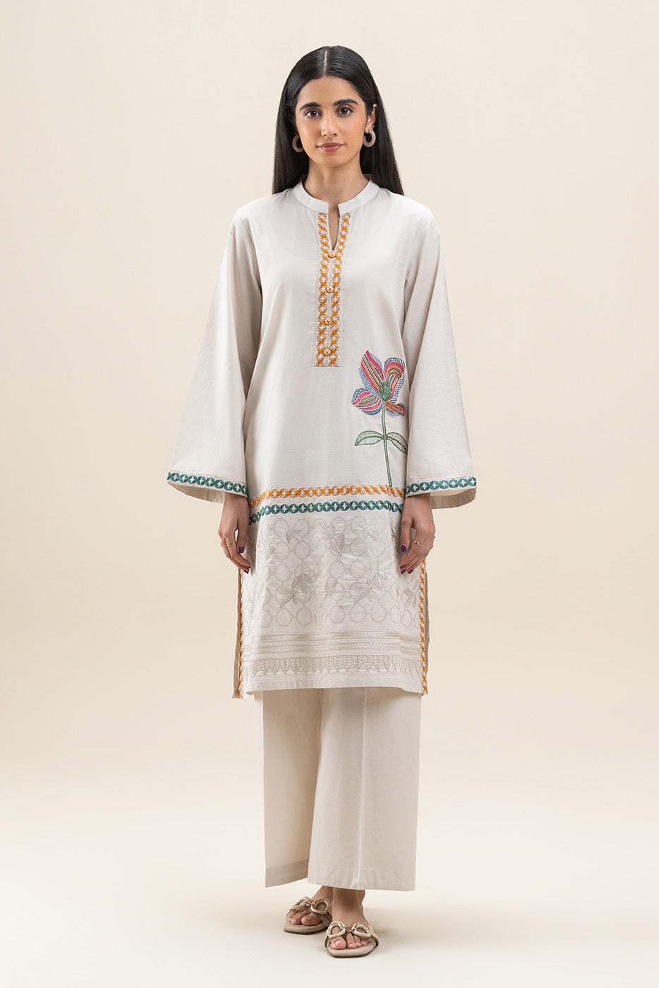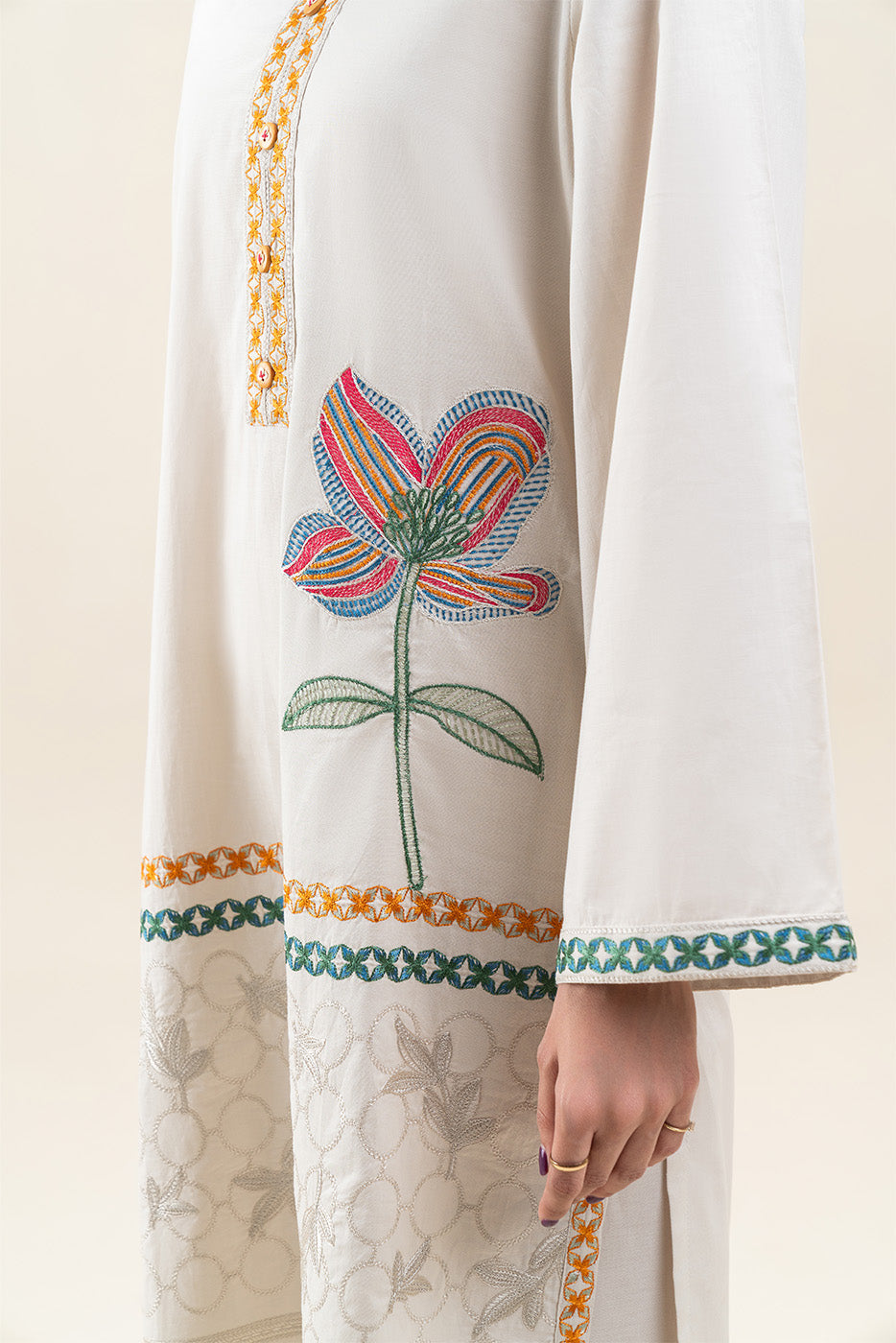 - Description: Embroidered shirt with band collar and placket with buttons detail. Paired with culotte pants to complete the look.