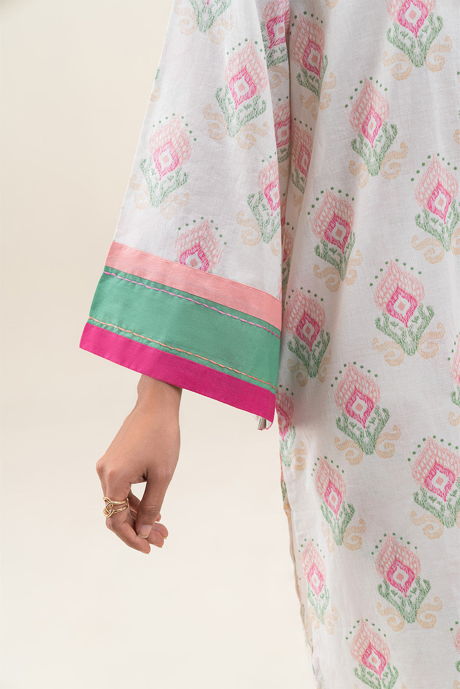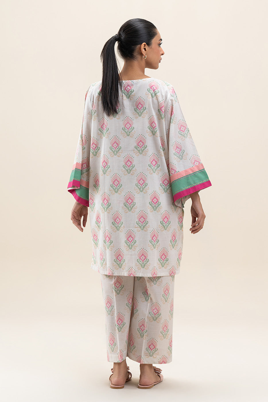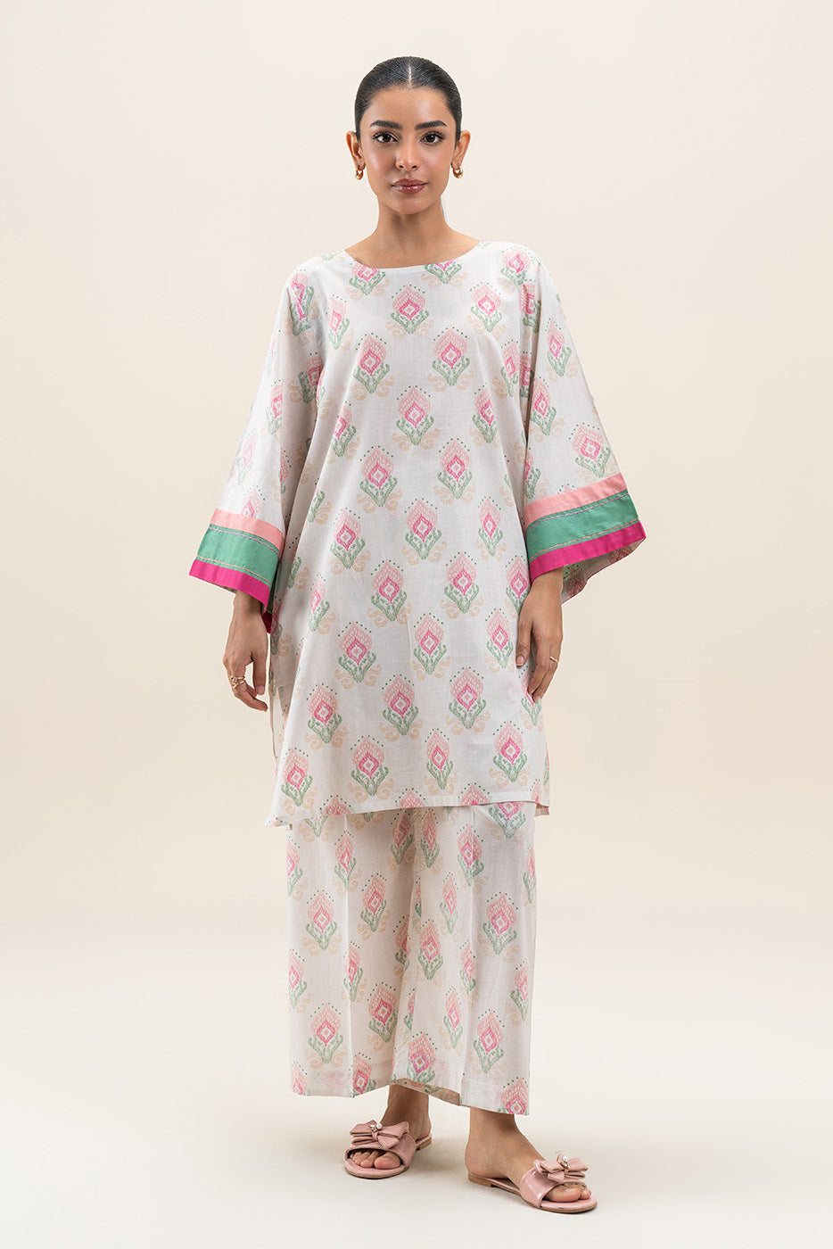 - Description: Elegant two-piece printed suit featuring a pastel geometric pattern with contrast pink and green cuffs for a chic, contemporary look.