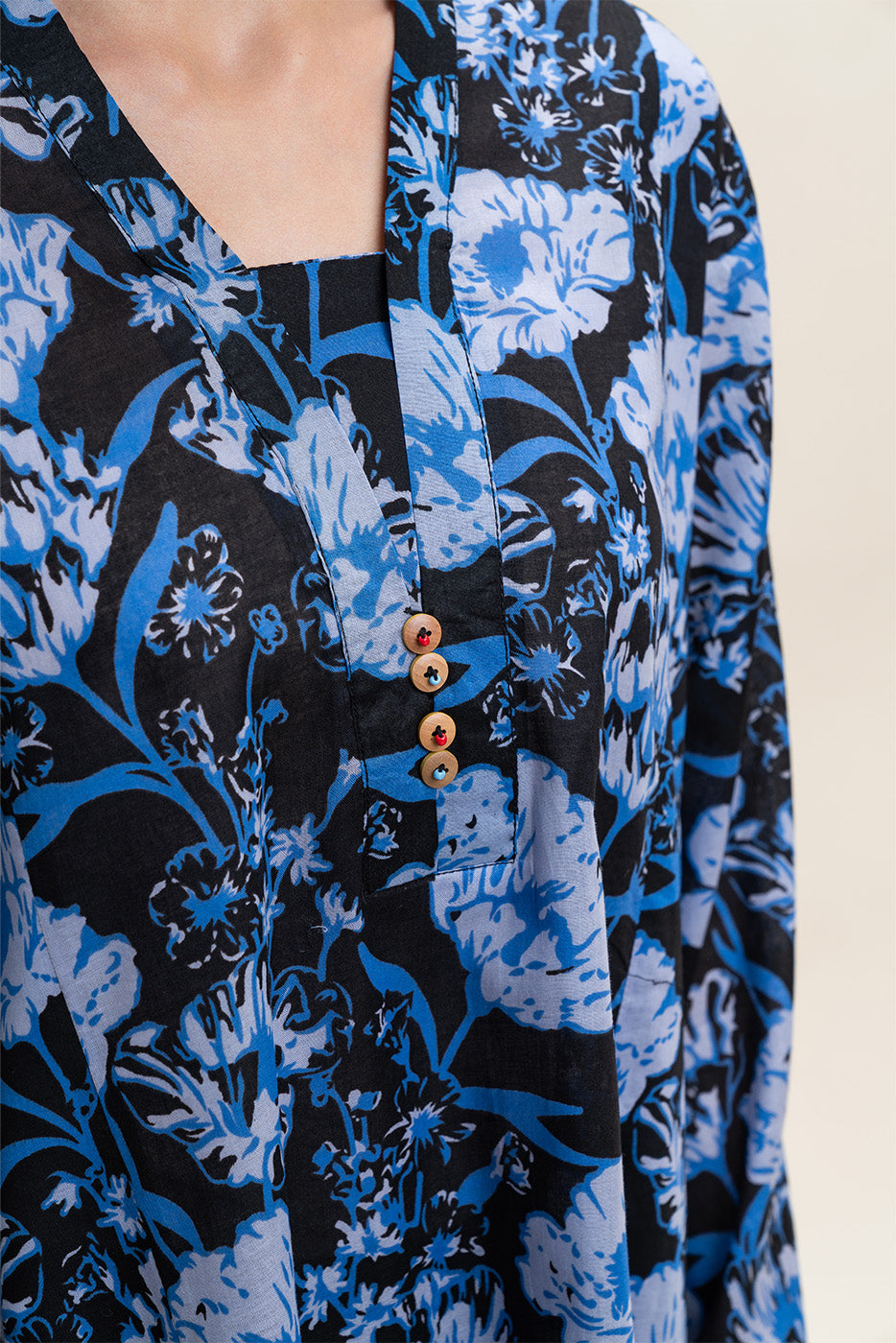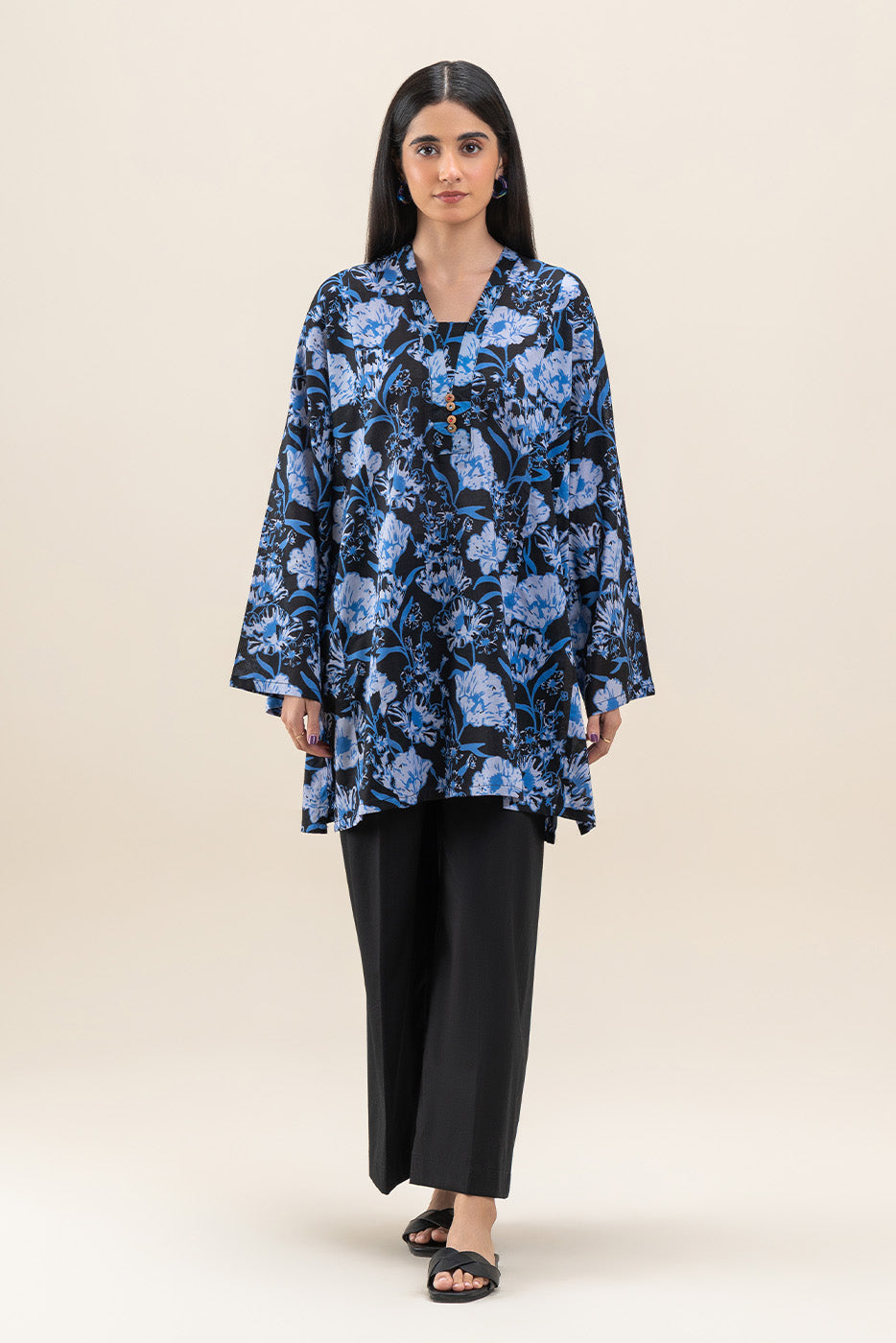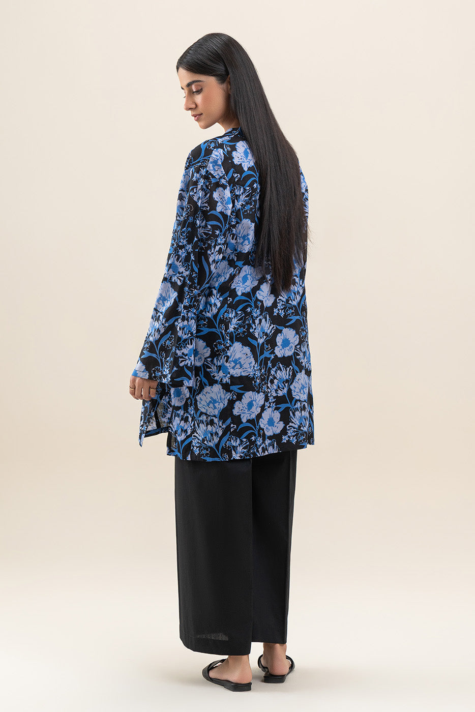 - Description: Flowy black shirt adorned with vibrant blue floral prints for a chic, relaxed look.