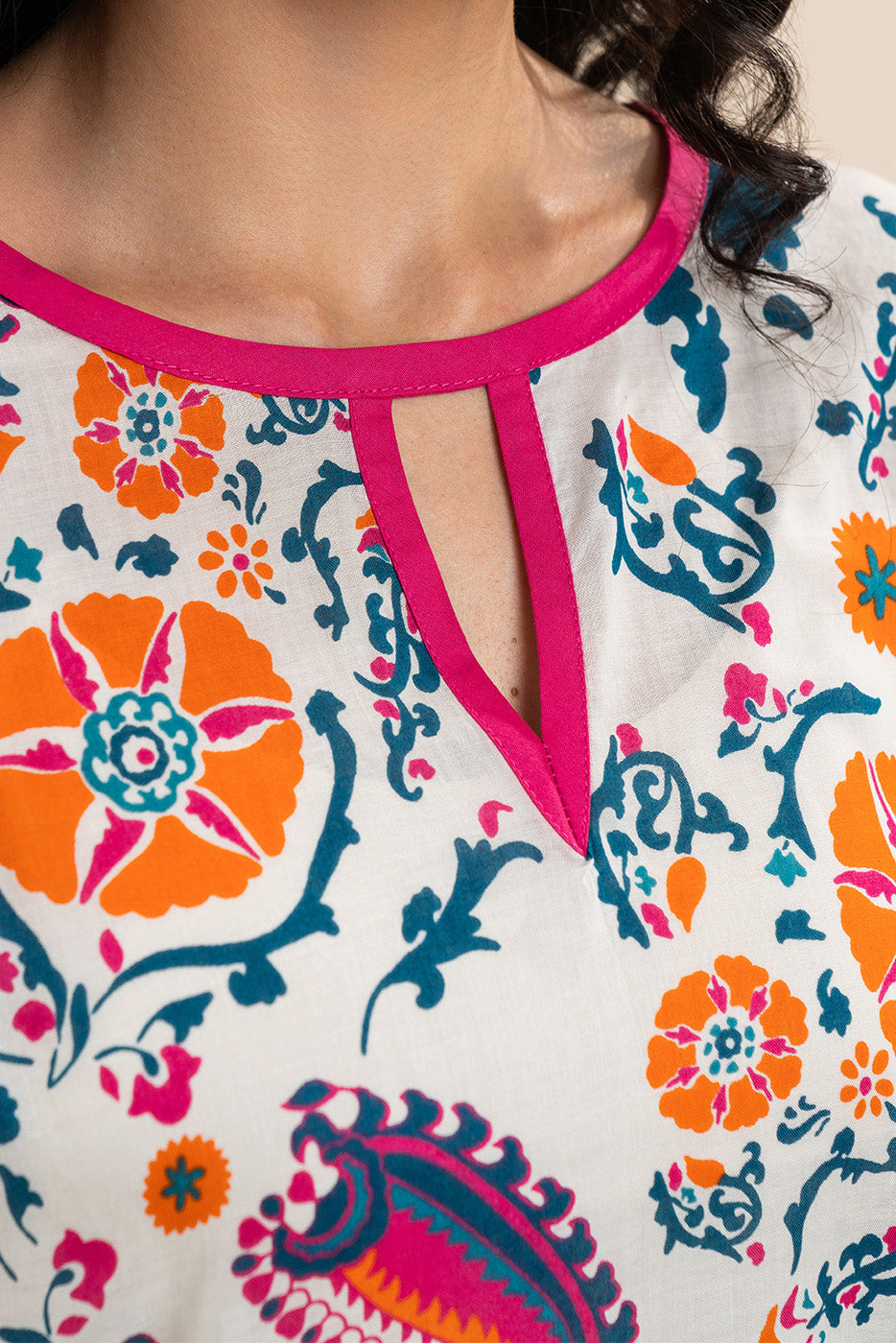 - Description: Basic printed tunic with accent color trim detail on neck and sleeves.