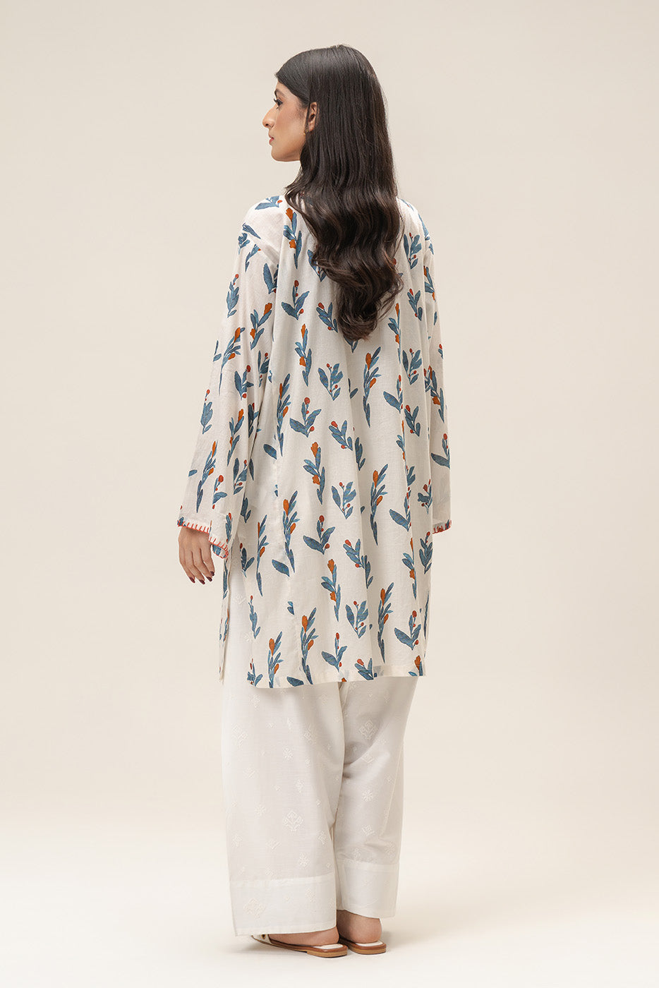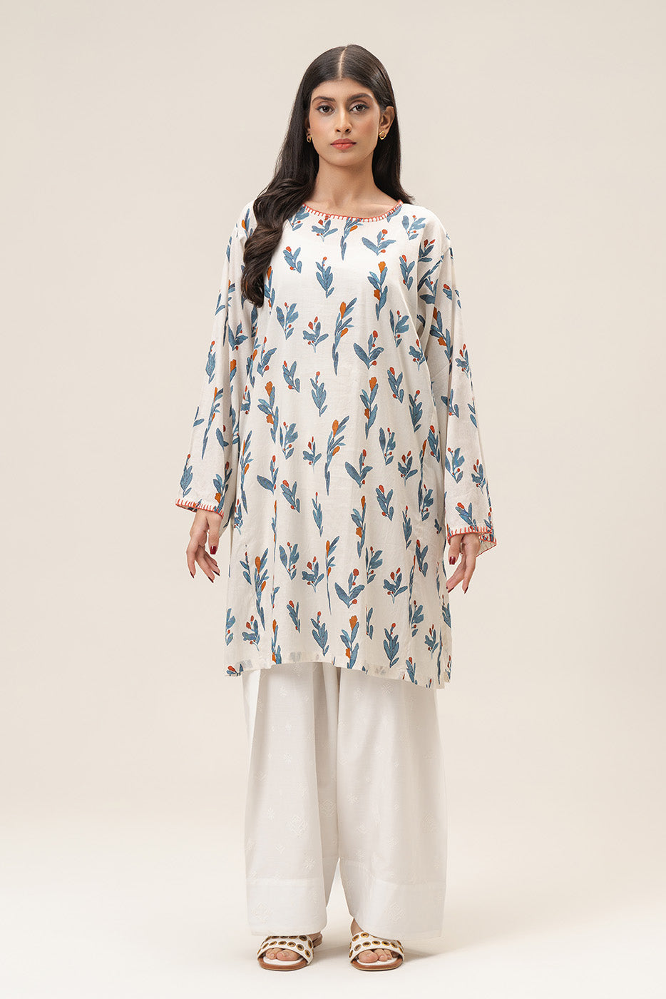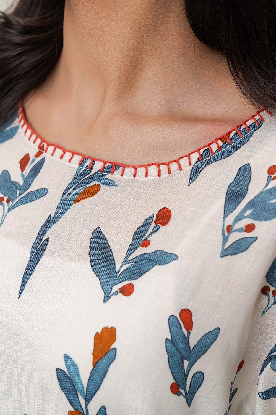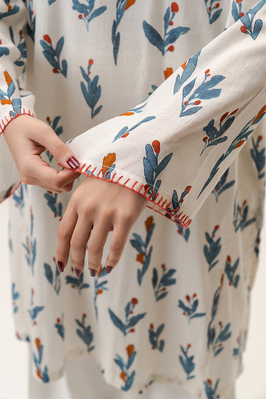 - Description: 1pc printed panelled shirt with handwork details on sleeves and neckline.