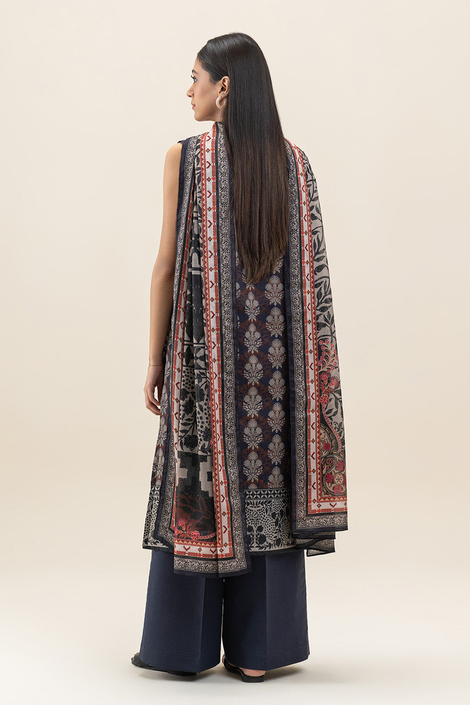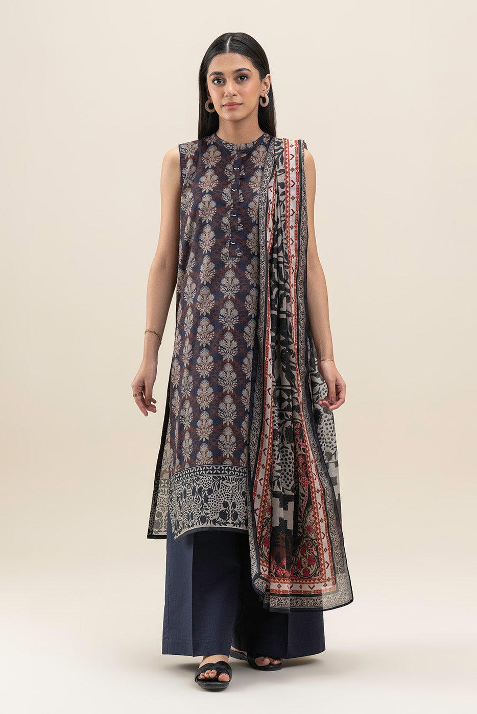 3 PIECE PRINTED LAWN SUIT-PITCH ASH (UNSTITCHED)