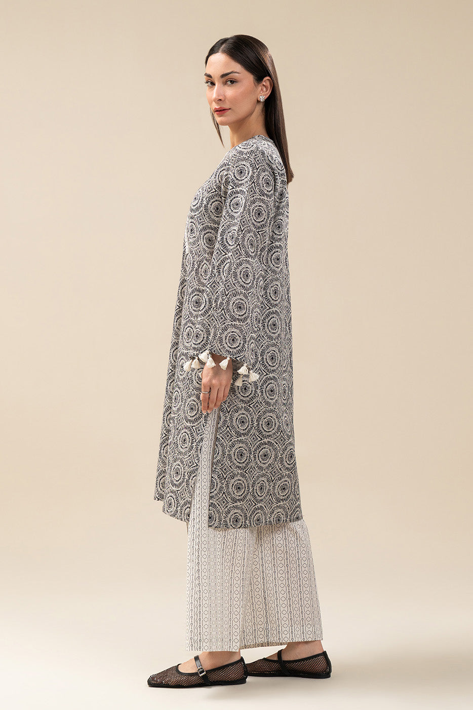 - Description: Digital Printed Mid Length Shirt With Accessories On Sleeves Paired With Culotte.