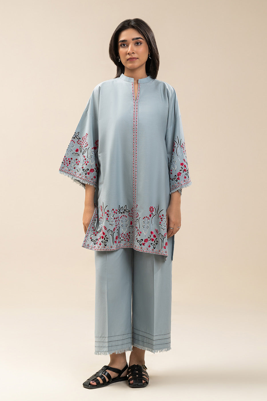 - Description: Embroidered Shirt With Band Collar And V-Slit And Frayed Edging Detail On Sleeves. Paired With Culotte Pants To Complete Th Elook.