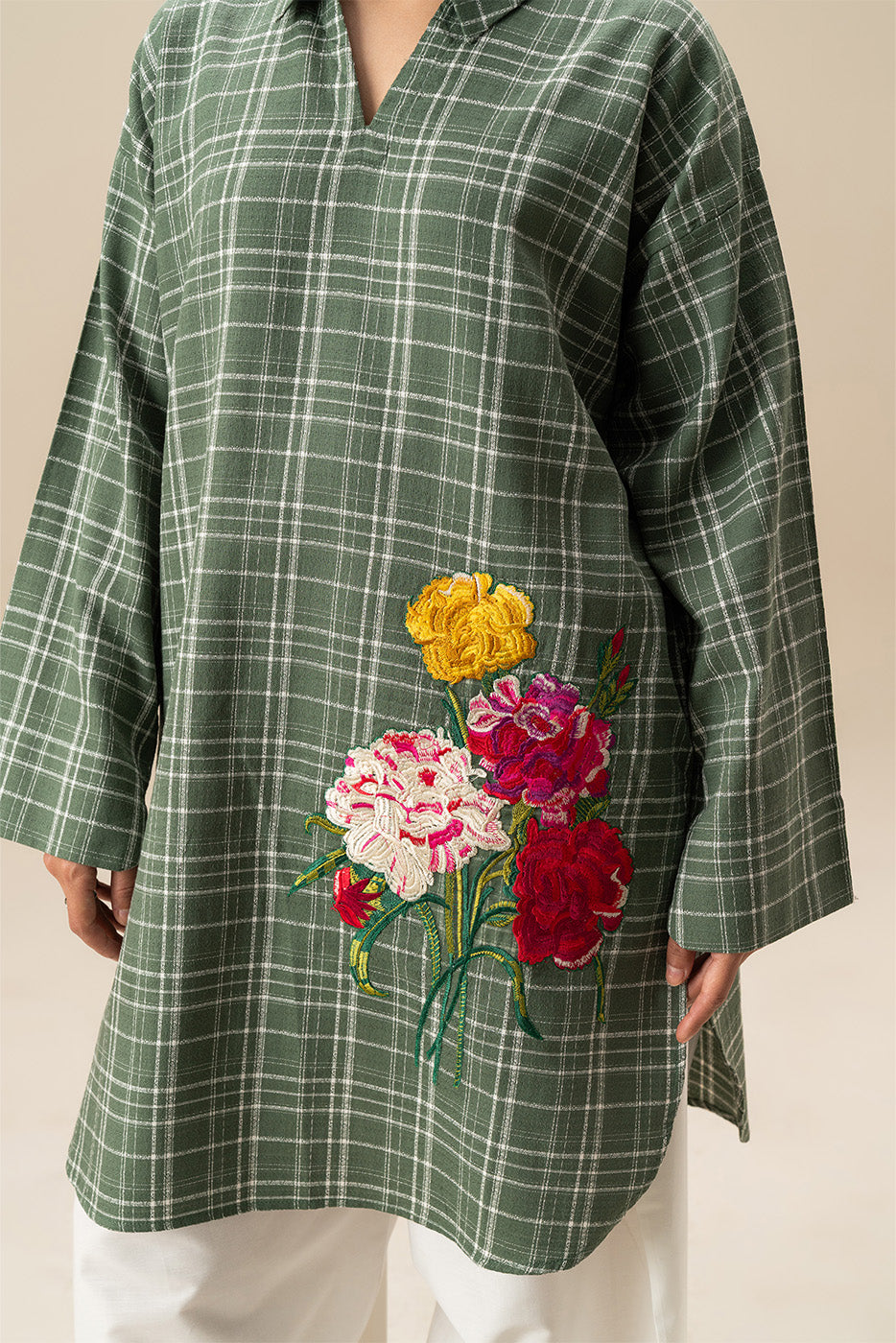 - Description: Trendy green checkered top featuring vibrant floral embroidery for a refreshing and chic everyday look.